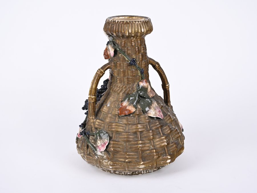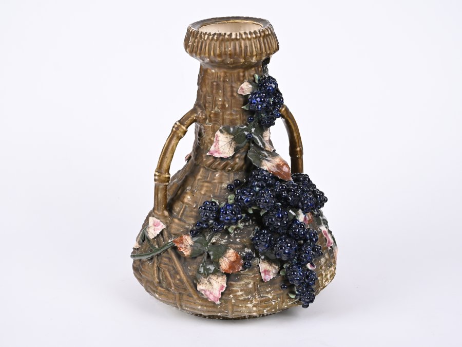 Secesní amfora a košík zdobený ostružinami. Výška 35 a 25 cm, značeno Amphora, číslováno.