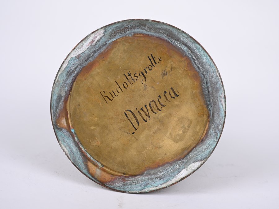 Malachitová orientální busta vyřezaná z masivního kusu kamene, může se jednat i o sbírkový předmět. Značeno zespodu "Rudolfsgrotte Divacca" tedy Skočjanské jeskyně v Divače, Slovinsko.