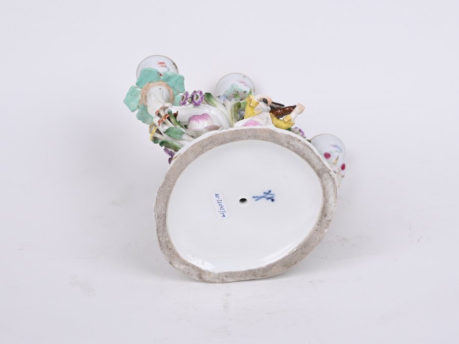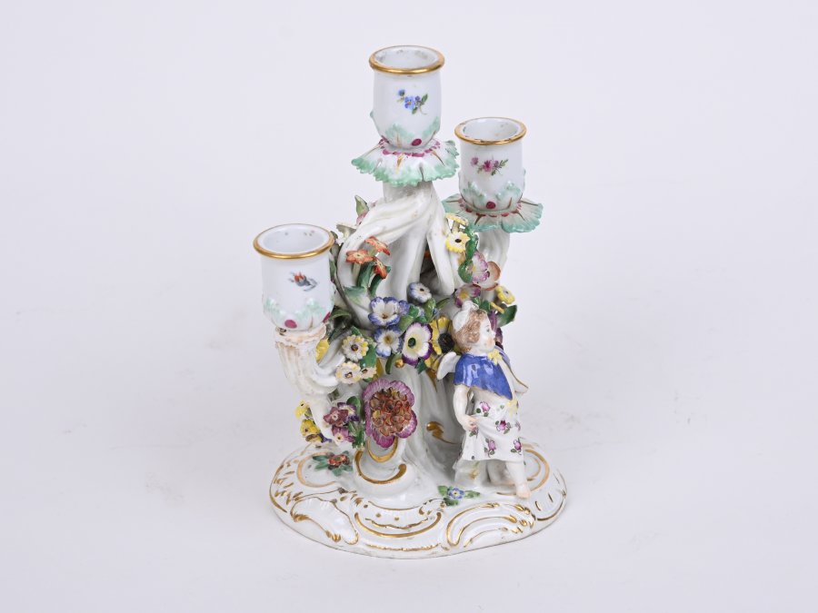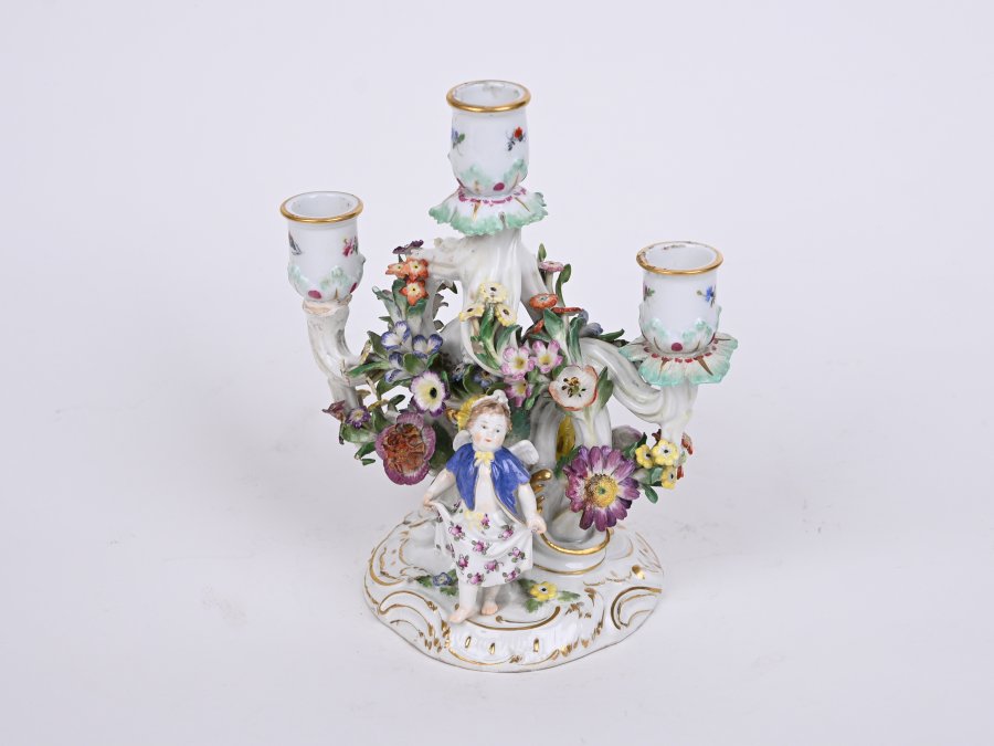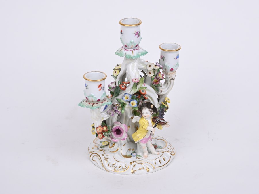 Lyrický míšeňský svícen s motivy květin a putti, drobná poškození, restaurováno.