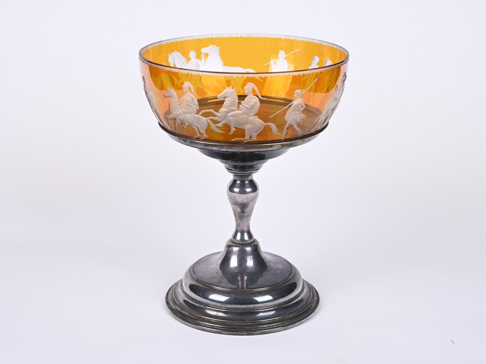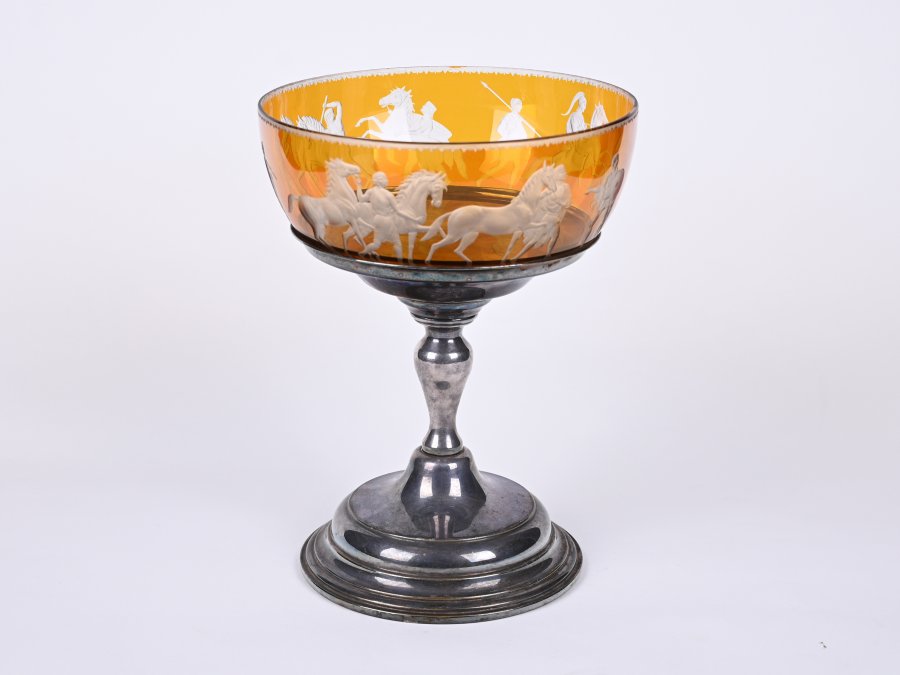 Nástolec z probrušovaného skla s motivy antických jezdců a koní. Skleněná miska usazena na podstavci z postříbřeného kovu.