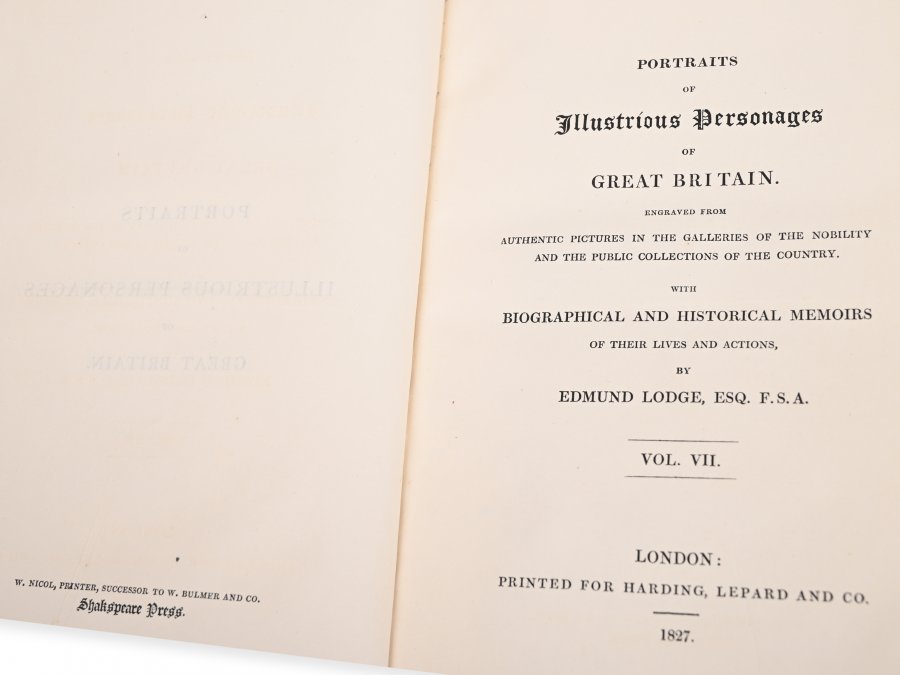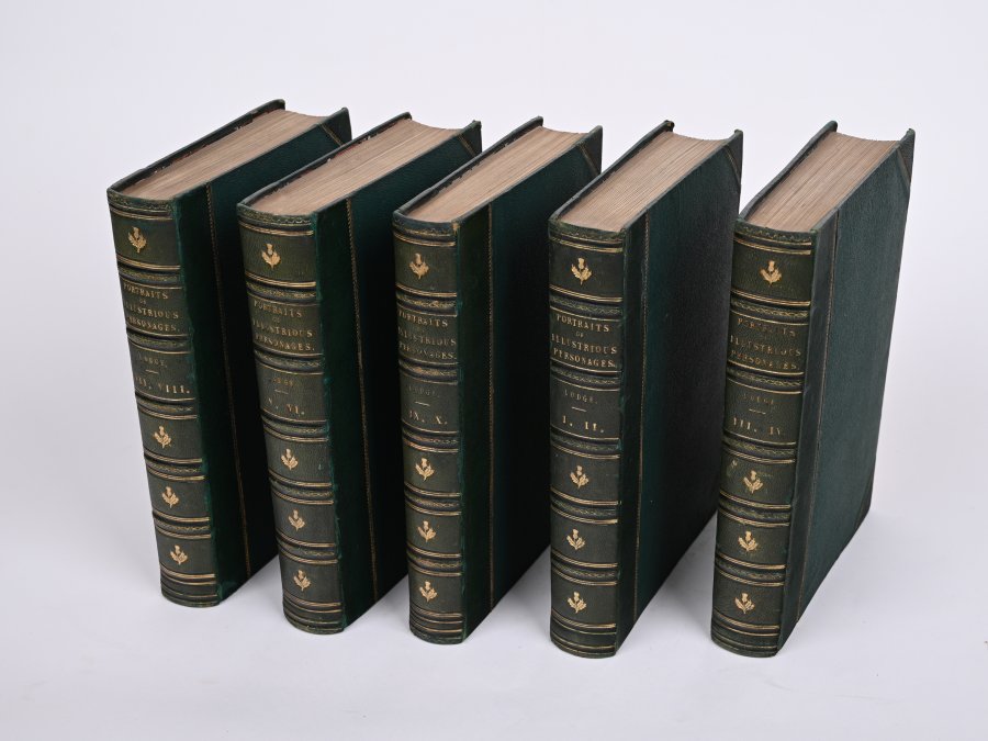 Titul "Portraits of illustrious personages of Great Britains. With biographical and historical memoirs of their lives and actions". Celkem 10 dílů v 5 svazcích, vydáno v Londýně. První vydání se 185 mědirytinovými portrétními tabulemi podle předloh starých mistrů (Holbein, Rubens, van Dyck, Gainsborough aj.). Luxusní tmavě zelená polokožená vazba se zlaceným hřbetem a ořízkami.