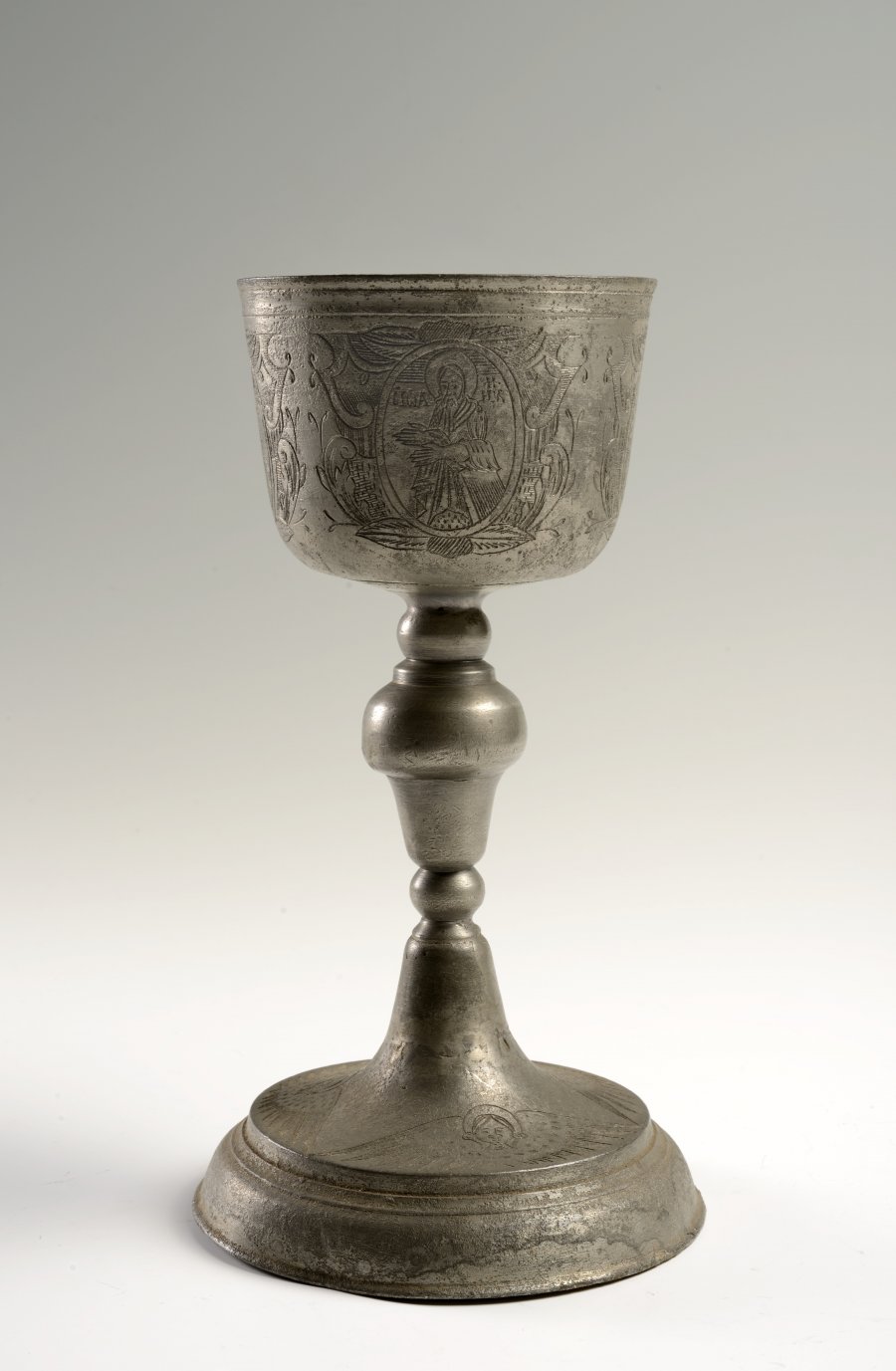 Cín, jeden pohár zdoben rytým figurálním dekorem světců, patrně pro ruský trh, částečně doplněna noha rytého poháru.