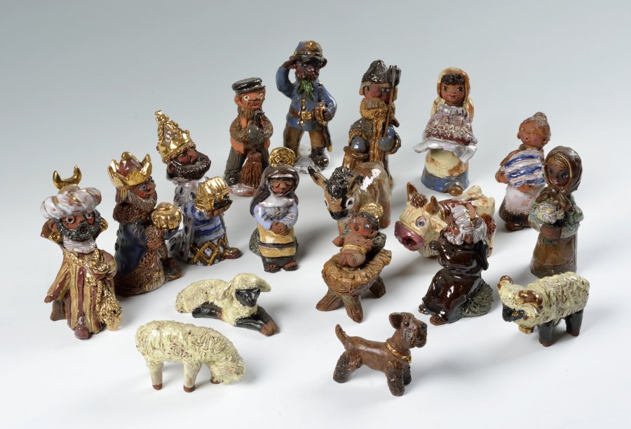 Betlém sestávájící z 18 figurek, pálená glazovaná hlína. Každá figurka signována zespodu.