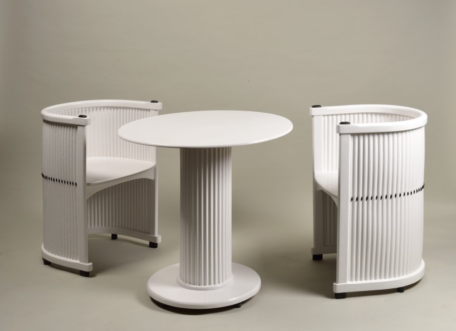 Sedací souprava sestávající ze dvou křesel a kulatého stolku na noze. Měkké dřevo, bíle a černě lakováno, restaurováno. Rozměry: křeslo 76 × 52 × 47,5 cm, stolek 75,5 × 49 cm. Literatura: Derek E. Ostergard: Bent wood and metal furniture 1850-1946, 1987, str. 81, 262-265.