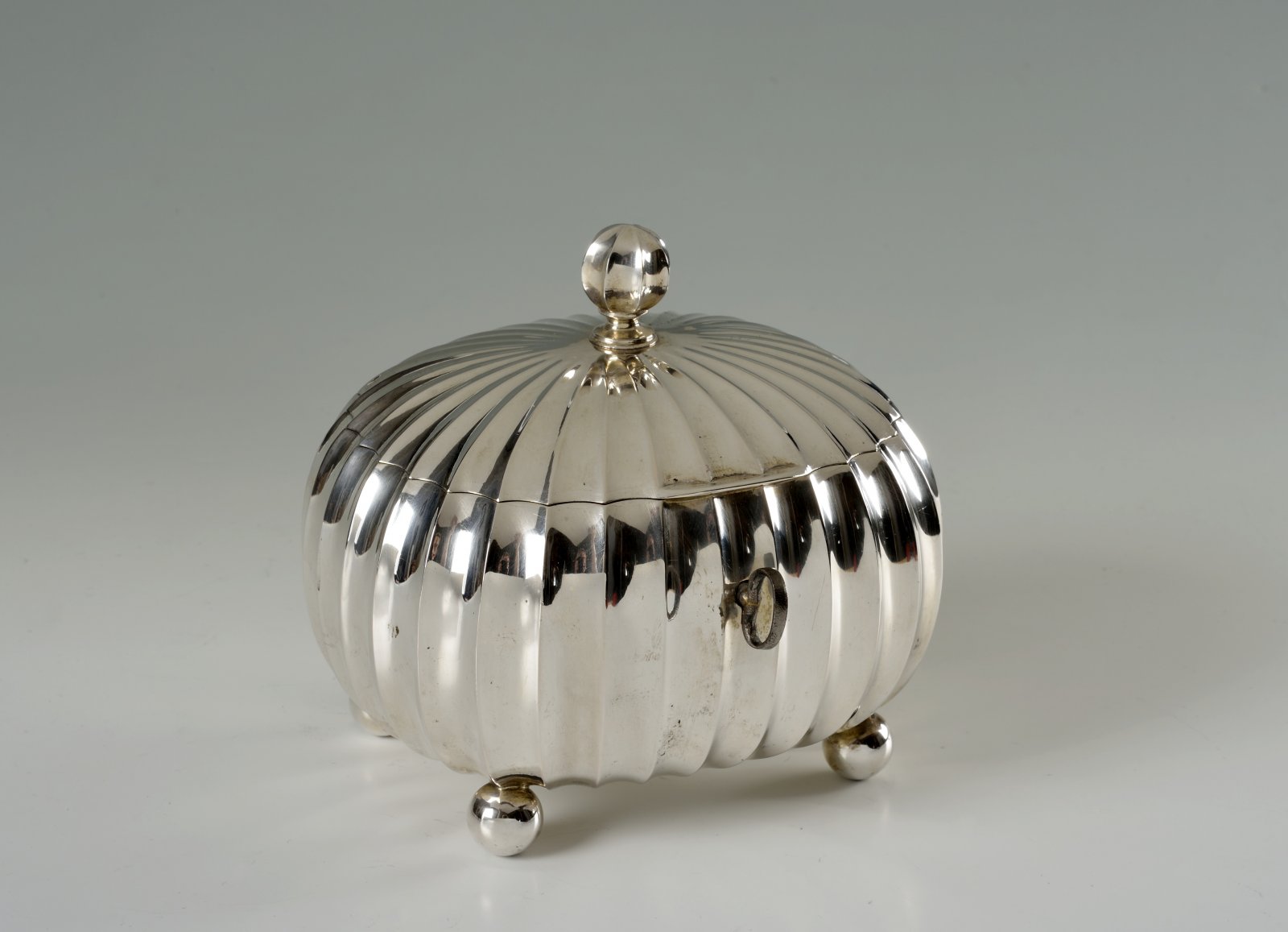 Stříbrná kanelovaná cukřenka na kulovitých nožkách.