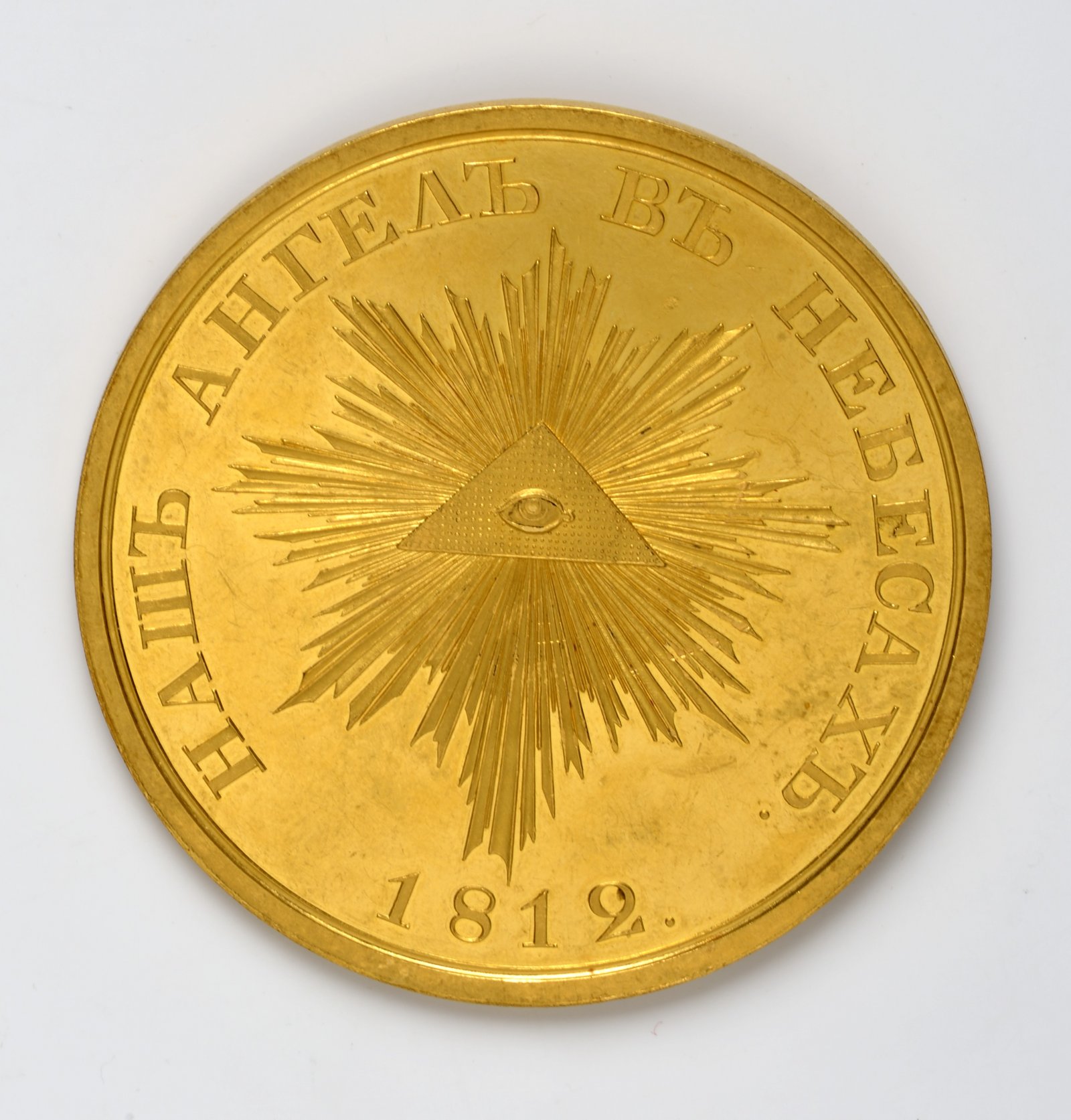 Raritní zlatá medaile ruského cara Alexandra I. připonímá jeho úmrtí roku 1825. Jedná se o autentickou ražbu z původních razidel a o numismatickou památku zcela mimořádné hodnoty. Předmět pochází z významné evropské šlechtické sbírky. Autor A. Klepikov. Posudek PhDr. Jiří Militký, Ph.D. Průměr 68 mm, váha 169,40 g.