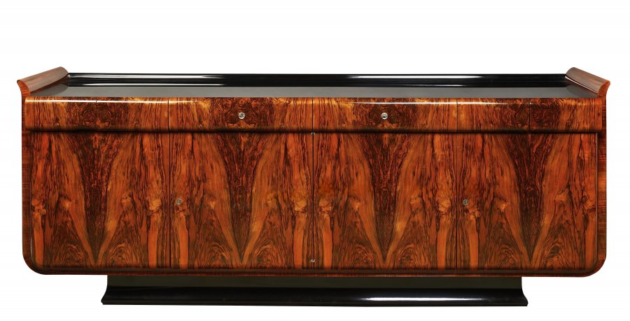 Nabízený bufet Tulipán je delší variantou ze souboru nábytku, který navrhl Jindřich Halabala pro UP Závody v Brně. Čelo je symetricky děleno dvojicí dvoukřídlých dveří a při horním okraji pásem zásuvek - dvě velké, dvě malé a dvě slepé. Ořechová dýha, černěné dřevo, šelaková politura, horní deska z černého skla původní, stejně jako kování a klíčky. Restaurováno.