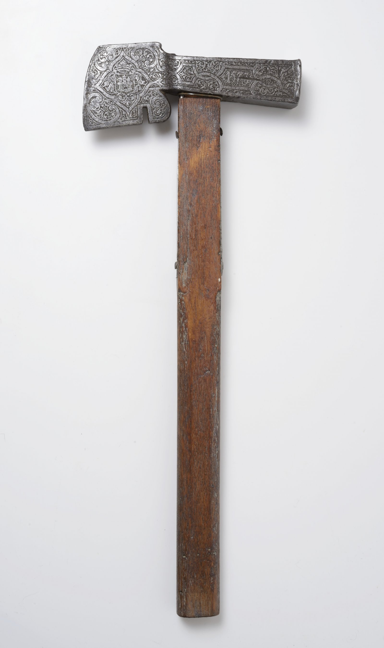 Čepel oboustranně zdobená leptanými ornamenty rostlin a rozvilin, na vnější straně lev s korunou, na vnitřní straně znak města pod korunou a datace 1573, délka 39 cm.