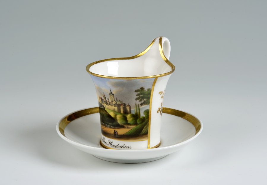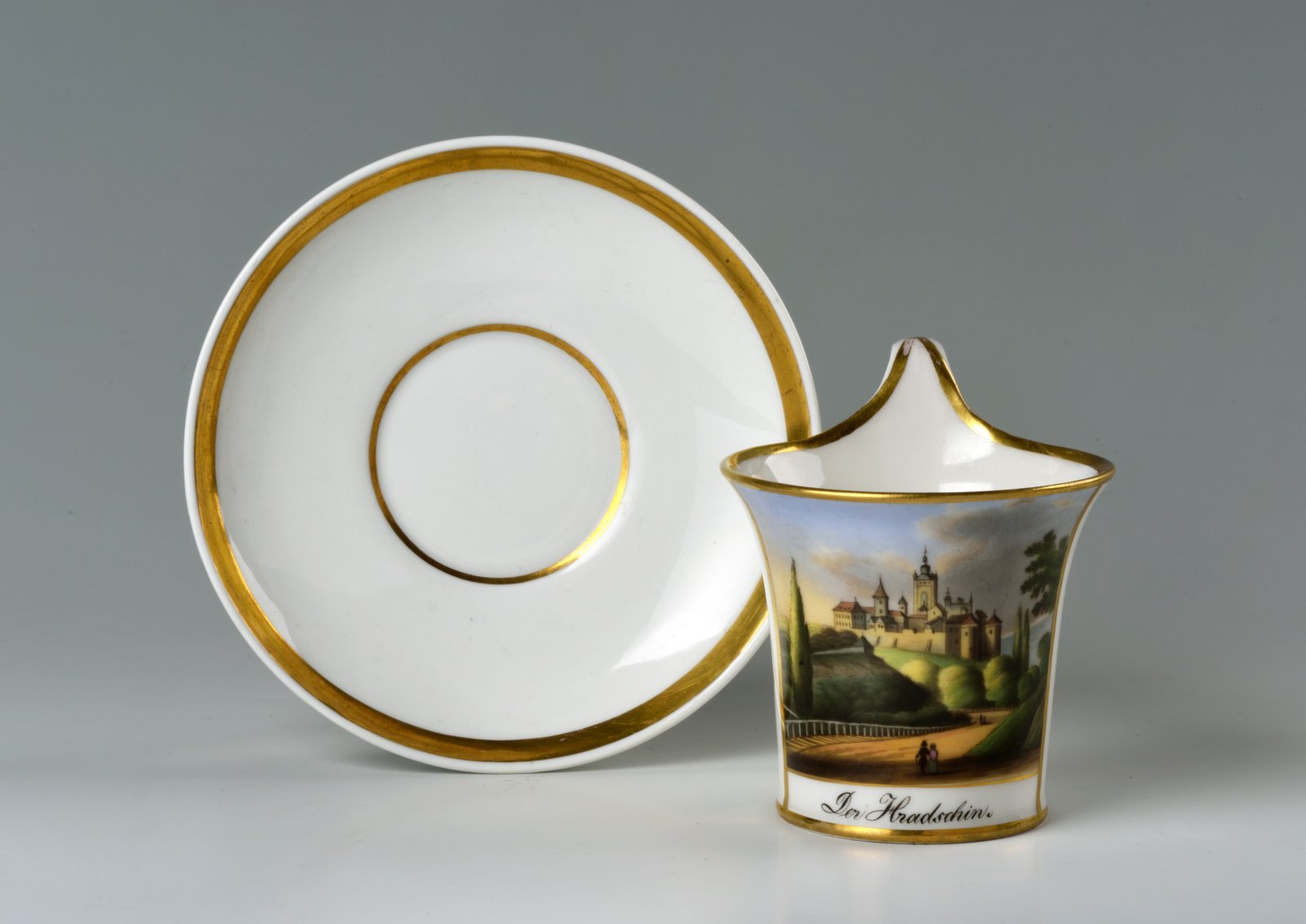 Vedutový šálek s pohledem na Hradčany od Jeleního příkopu. Značeno tlačenou značkou CF (Christian Fischer), Pirkenhammer, Březová.