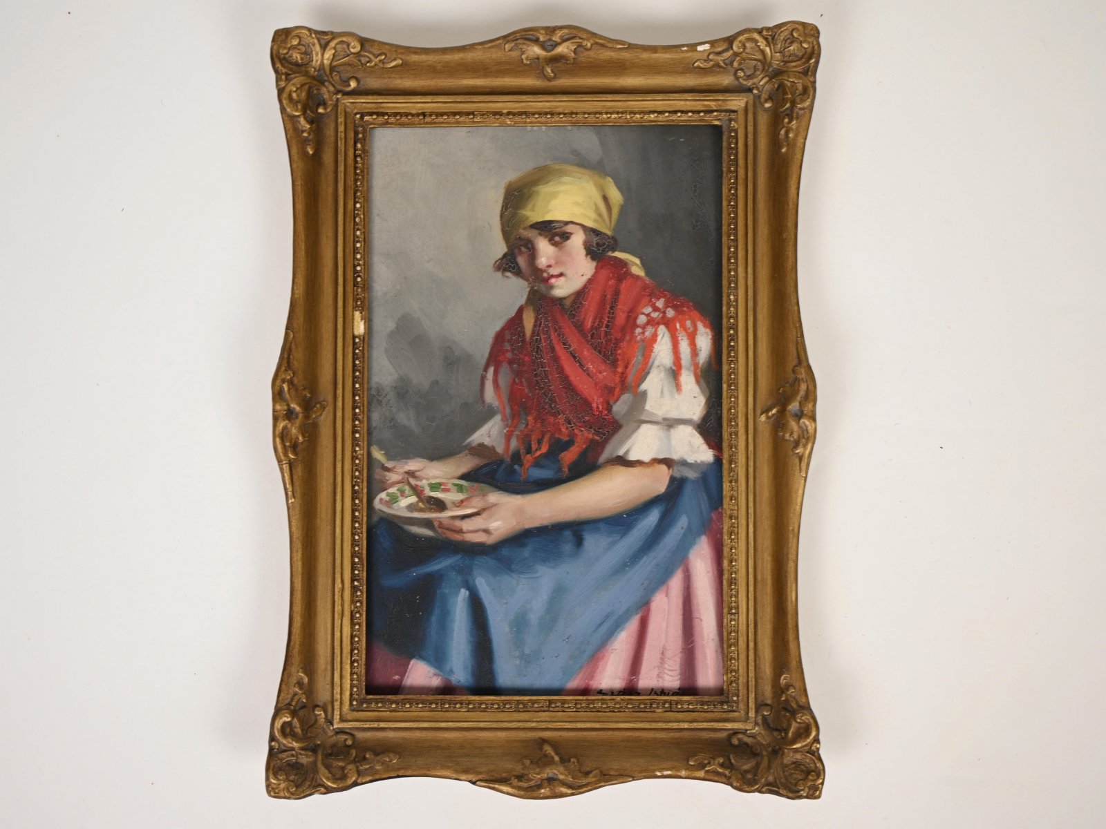 Portrét vesnické dívky v plédu a zástěře s talířem polévky.