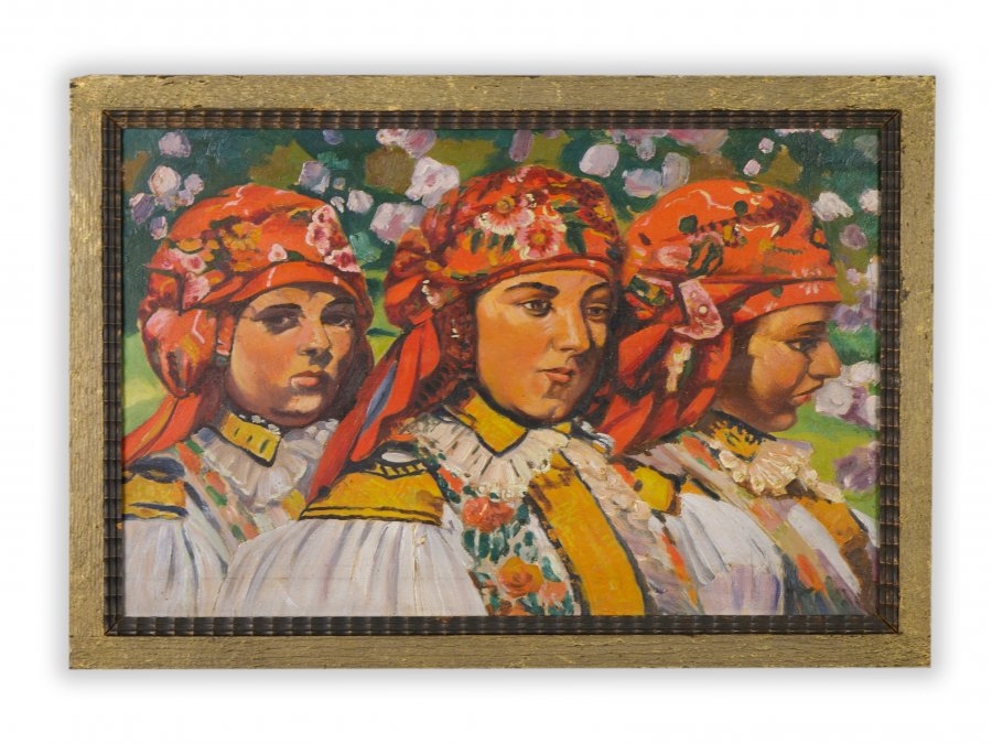 Trojice děvčat v krojích u rozkvetlé jabloně.