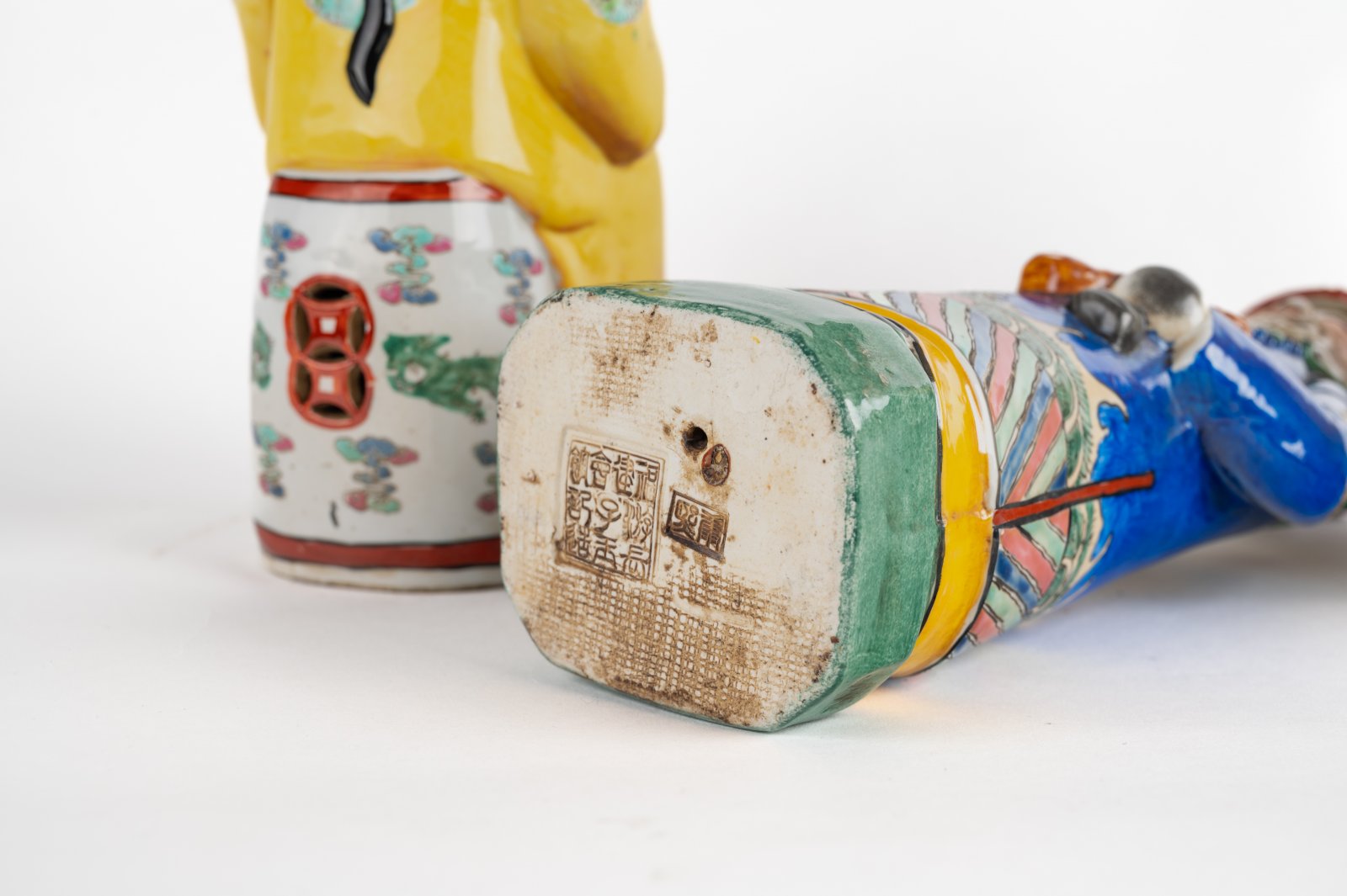 Tři glazované porcelánové figury sedících panovníků ve slavnostním oblečení. Značeno raženou značkou naspodu. Ca 35x12x10 cm. Dvě z nich jsou stejné.