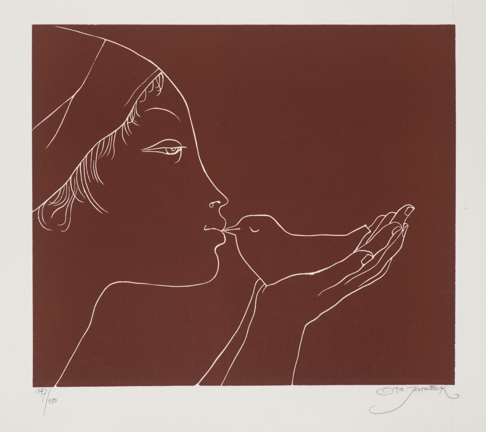 Portrét dívky s ptáčkem v červeném provedení je od významného všestraně nadaného malíře Oty Janečka, který ve své tvorbě vycházel z domácí tradice i z odkazu evropské moderny. Od počátečních impulzů kubismu, lyrického figuralismu či francouzského kolorismu, obracel pozornost k vlastnímu nezaměnitelnému projevu. Proslulé jsou jeho kresby a grafiky ženských aktů. Uvedený rozměr je rozměr listu. Číslováno 147/180.