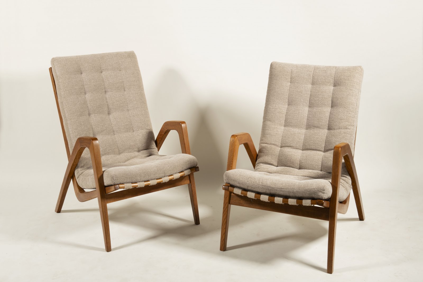 Dvě designová křesla od návrháře Jana Vaňka, významného českého výrobce nábytku, architekta a spoluzakladatele Spojených uměleckoprůmyslových závodů. Pracoval s významnými architekty své doby, jako jsou například Jan Kotěra nebo Josef Gočár, mimo jiné se podílel na vybavení vily Tugendhat. Jeho nábytek vyniká čistými a nadčasovými liniemi. Model nabízeného křesla navrhl na sklonku své kariéry, kolem období Expa 1958 a řadí se do Bruselského stylu. Kompletně restaurováno.