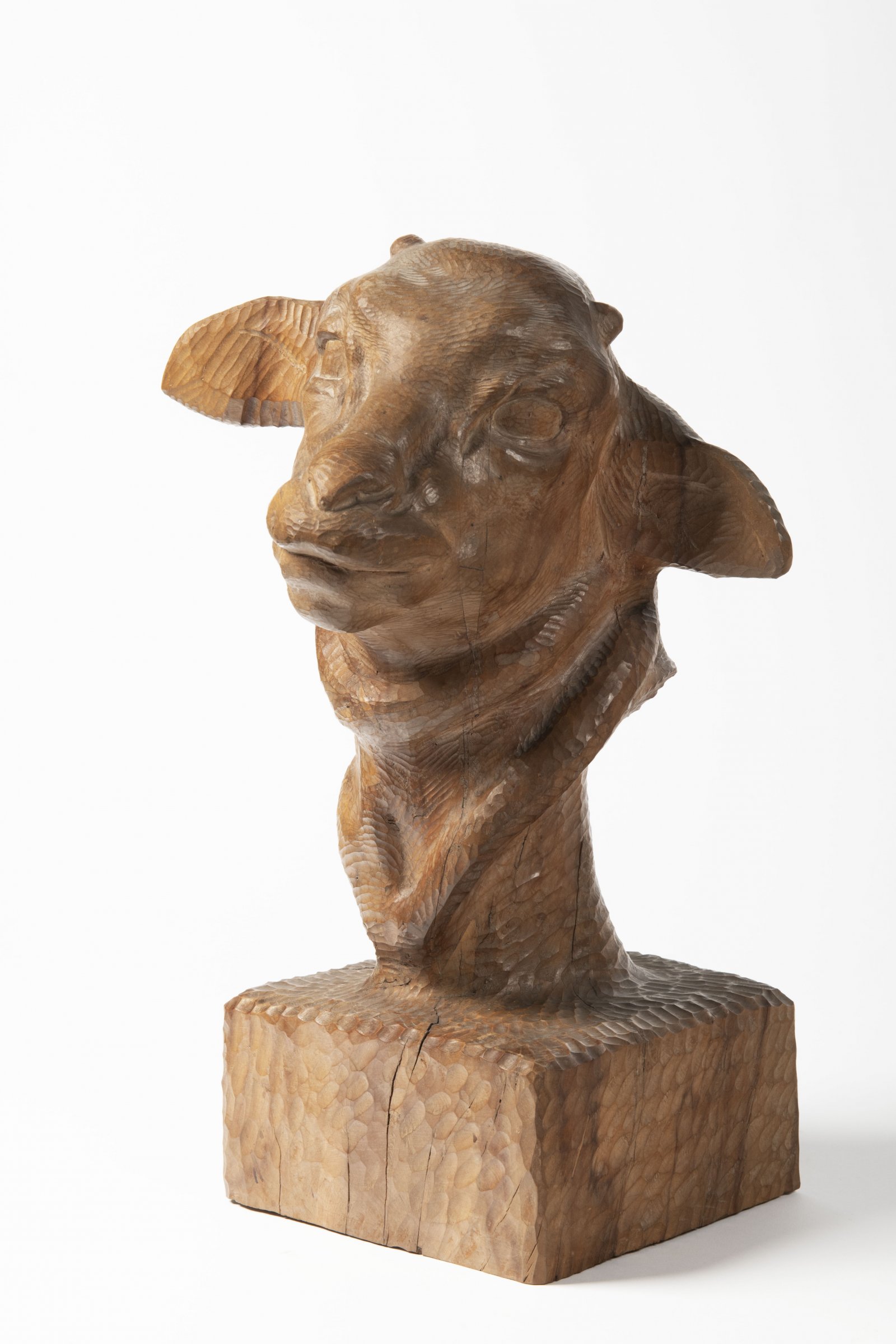 Volně řezaná plastika hlavy beránka se stylizovanou modelací a přiznanými stopami nástroje, osazená na jednoduchém kvádrovém podstavci. Z pozůstalosti sochaře Bohumila Kafky.