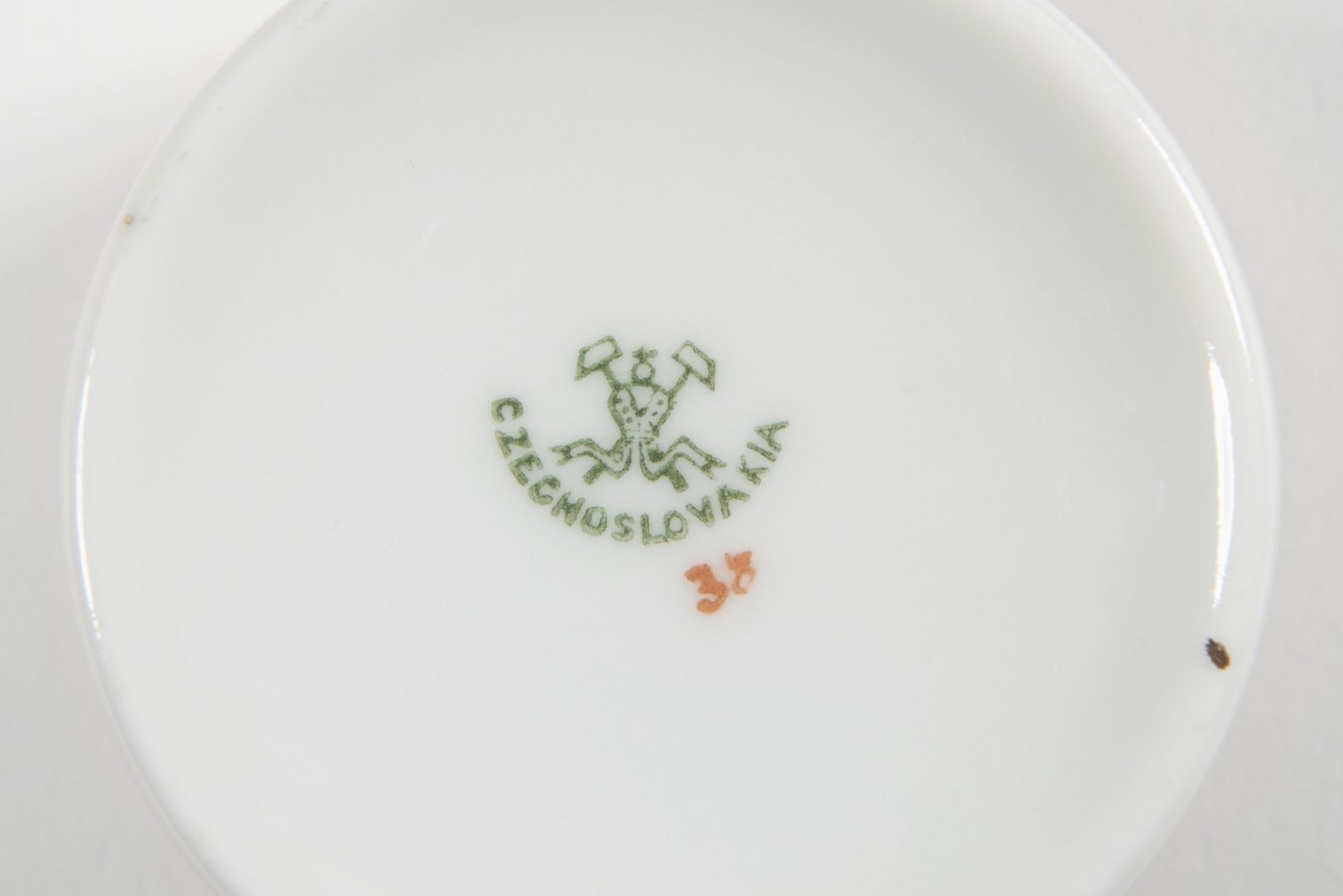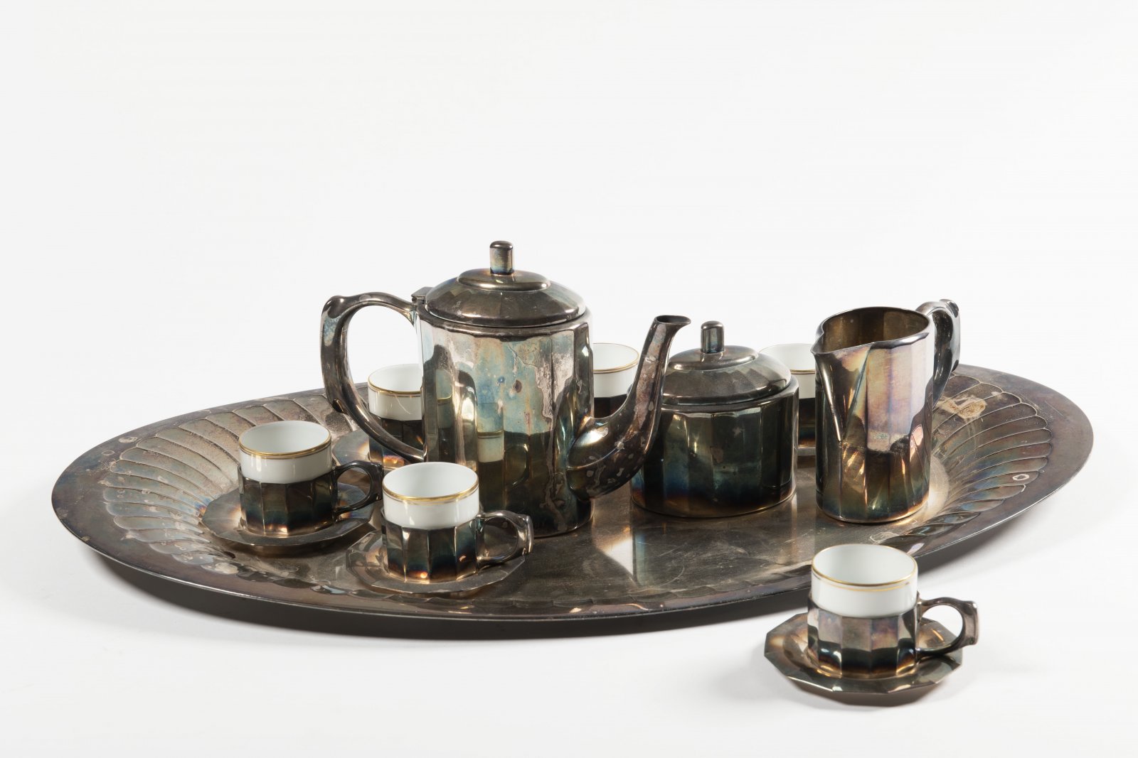 Kávový servis sestávající z konvice, cukřenky, konvičky na mléko, šesti šálků s podšálky a oválného podnosu. Nádoby a podnos z alpaky s plasticky členěným povrchem a irizující patinou, šálky a podšálky porcelánové s kovovou montáží a zlaceným okrajem.