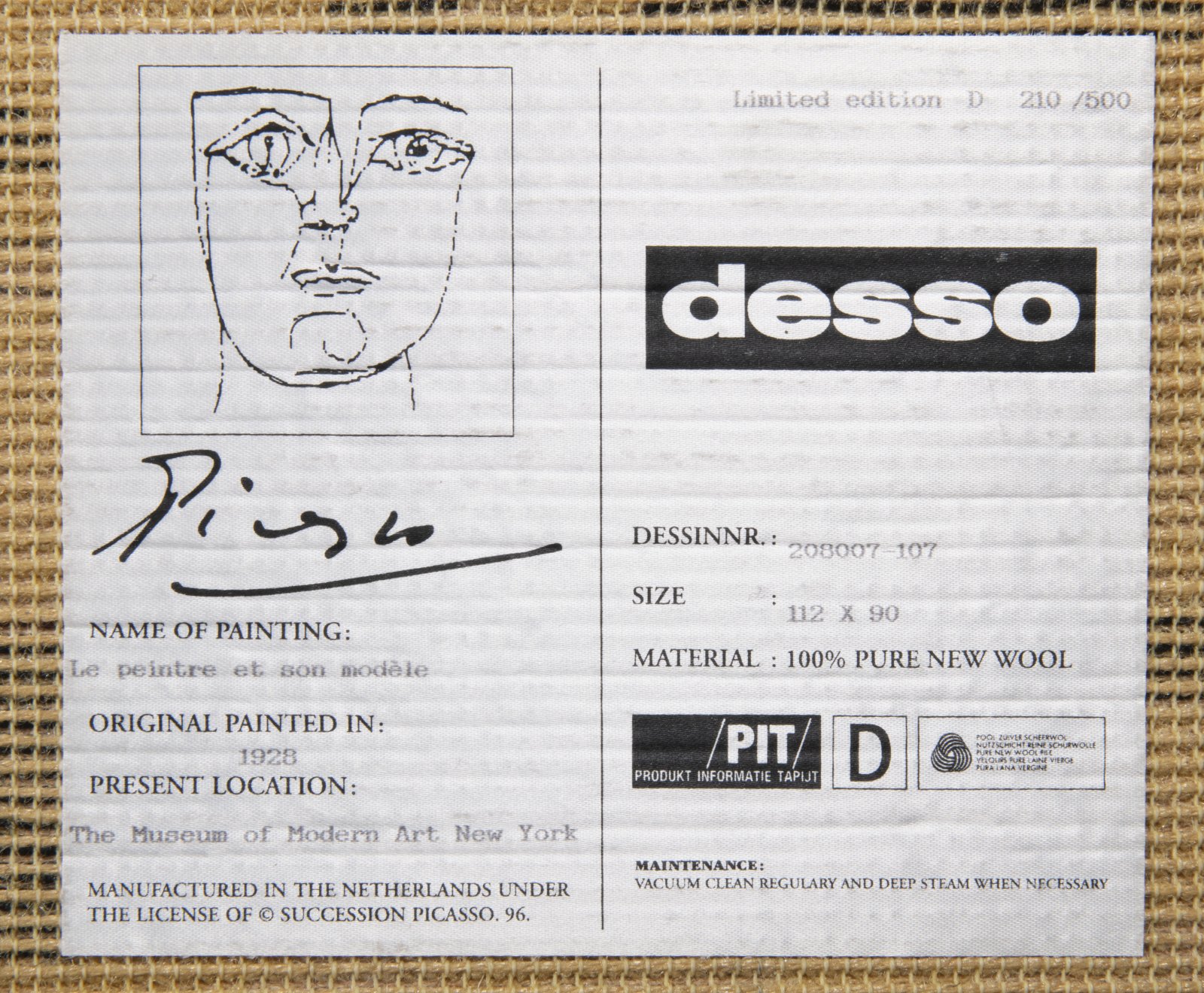 Obraz Le Peintre et Son modèle (Malíř a jeho model) od Pabla Picassa z roku 1928 se v současné době nachází v Muzeu moderního umění v New Yorku. Výrobce: Desso, Nizozemsko, na základě licence od Succession Picasso z roku 1994. Díky tomu je tento výrobek autorizovaným Picassovým multiplikátem. Desso je předním výrobcem kvalitních koberců. Jedná se o limitovanou edici - číslované na zadní straně na štítku vydavatele: 210/500.