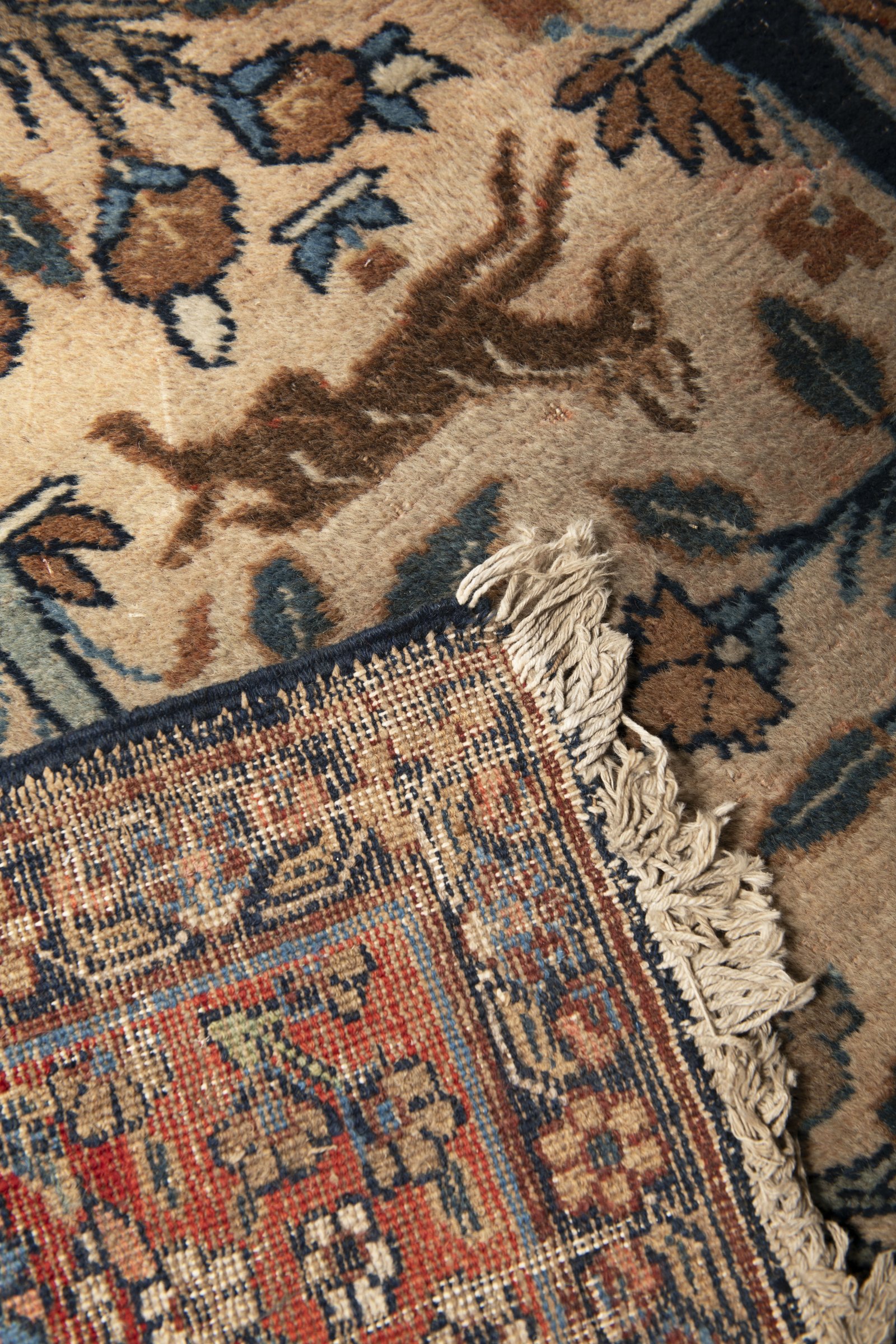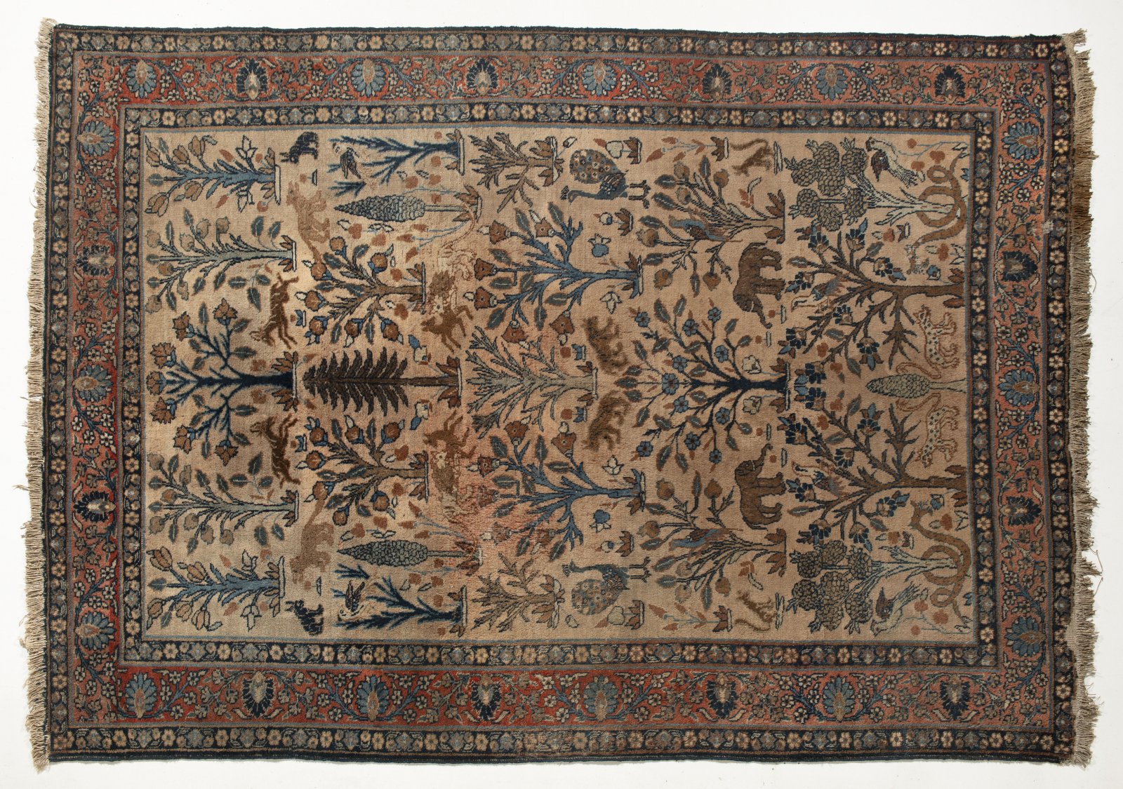 Ručně vázaný, velmi atraktivní a starožitný vlněný koberec na bavlněné osnově. Unikátní kompozice neobvykle naturalistického vyznění zobrazuje rajskou zahradu s pestrou faunou i flórou, mj. s neobvyklým párem slonů i pávů, s hady obtočenými okolo stromů s granátovými jablky, se ztepilými kuželovitými cypřiši a s párem levhartů apod. Reprezentativní koberec vzácného designu.
