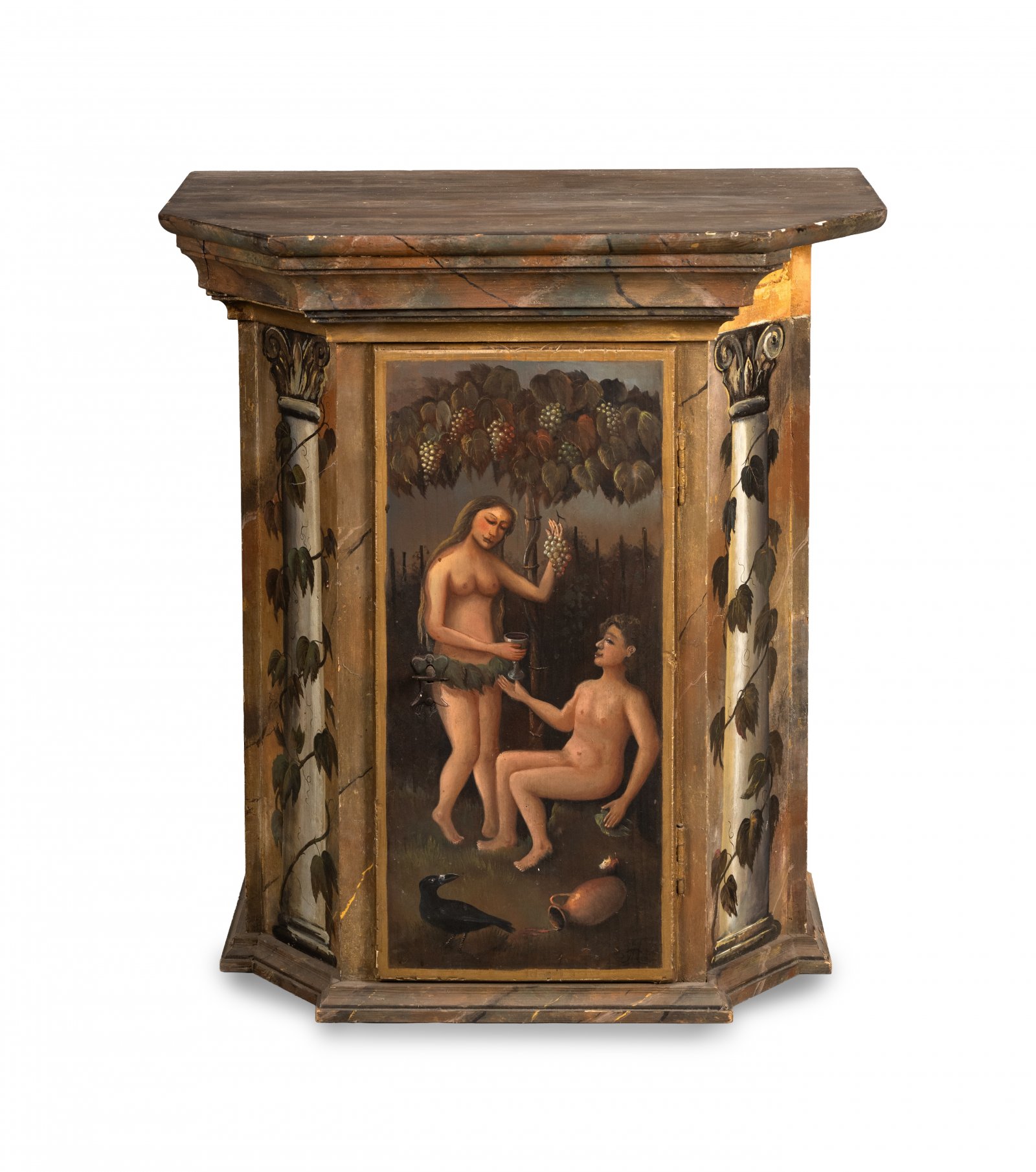 Lidový malovaný kabinet s mramorováním a malbou Adama a Evy. Chybějící římsa.