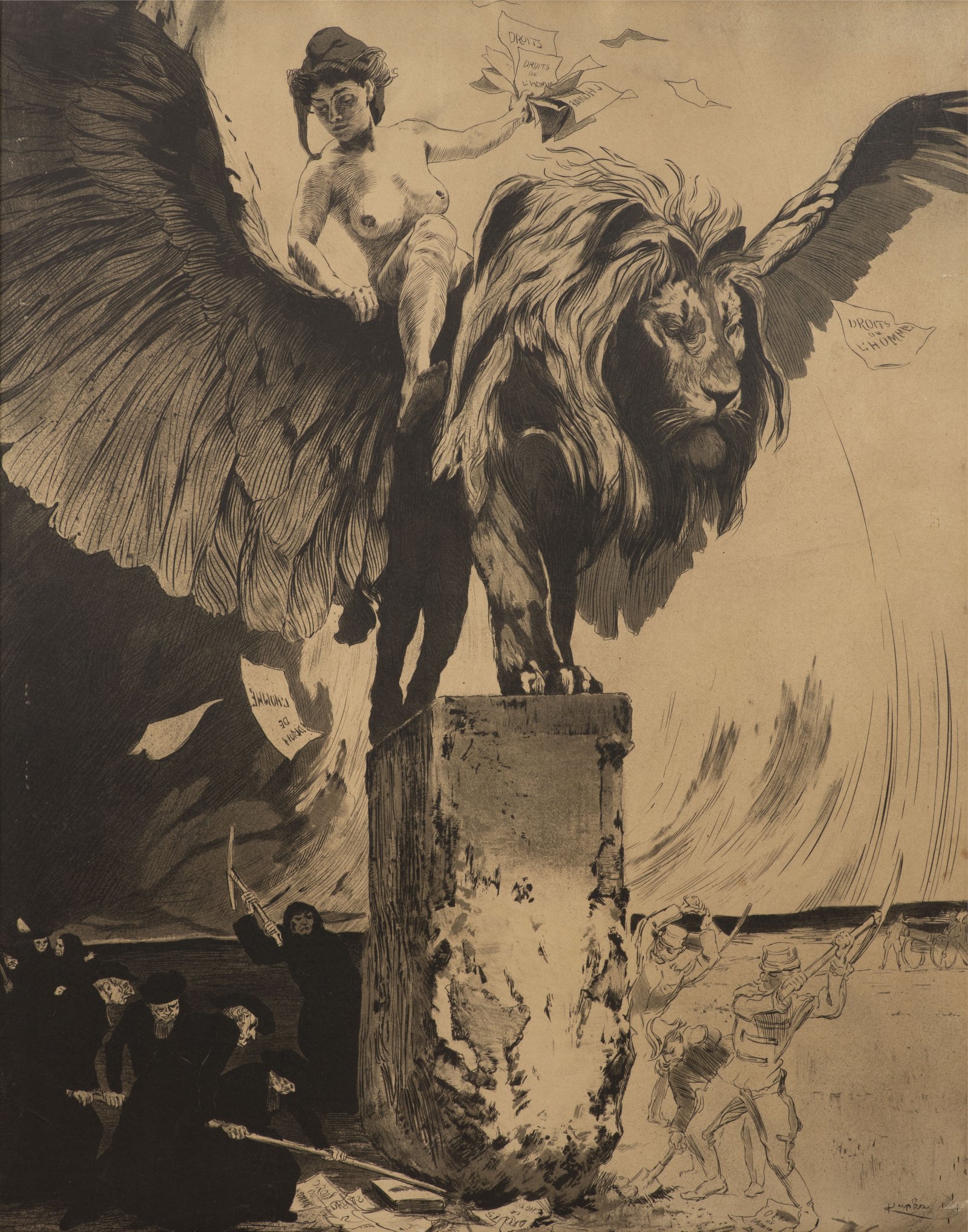 Symbolistní výjev nahé dívky na okřídleném lvu, která pouští letáky po větru. František Kupka se zabýval před svým přerodem do abstrakce metaforami, snovými vizemi, spiritualismem a symbolismem.
