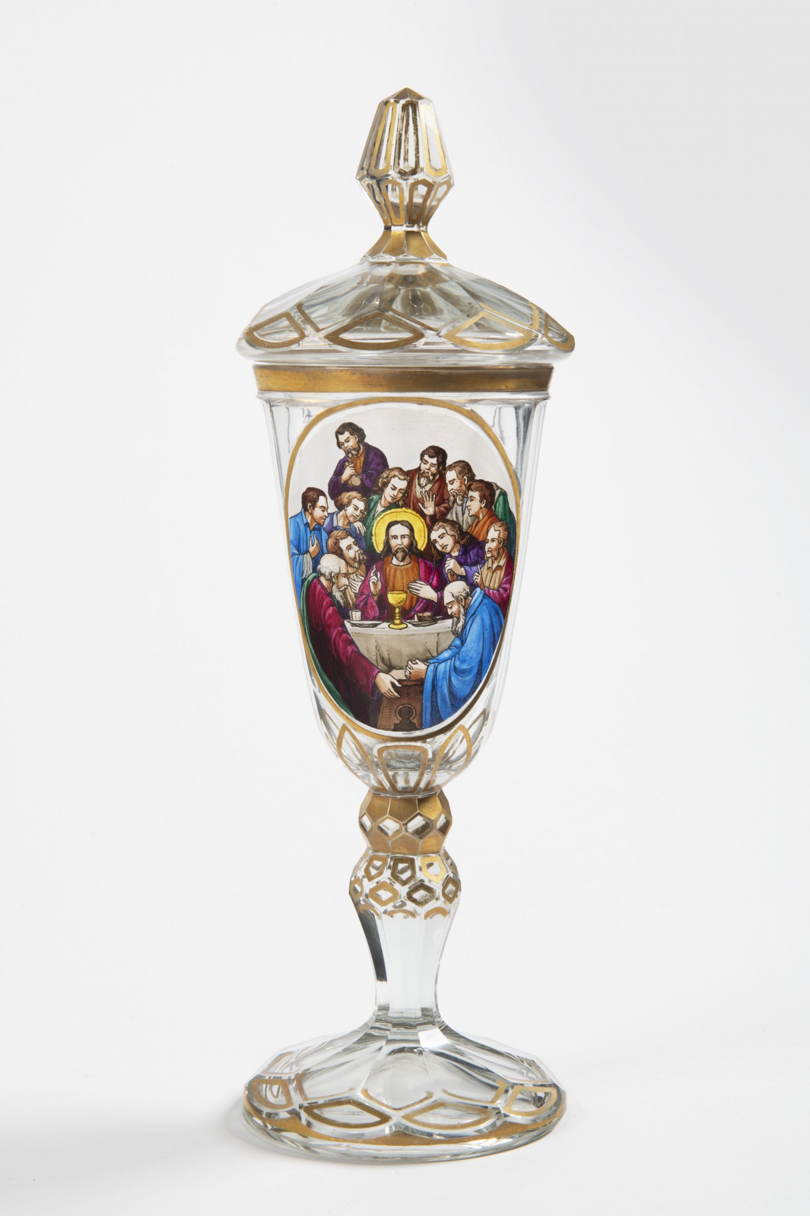Pohár na balustrované fazetové noze a patce, s víkem s fazetovaným knopem. Povrch je dekorován zlacenými geometrickými prvky a centrálním medailonem s ručně malovaným výjevem Poslední večeře. Malba je provedena v ikonografii odpovídající pozdně historizujícímu sakrálnímu stylu.