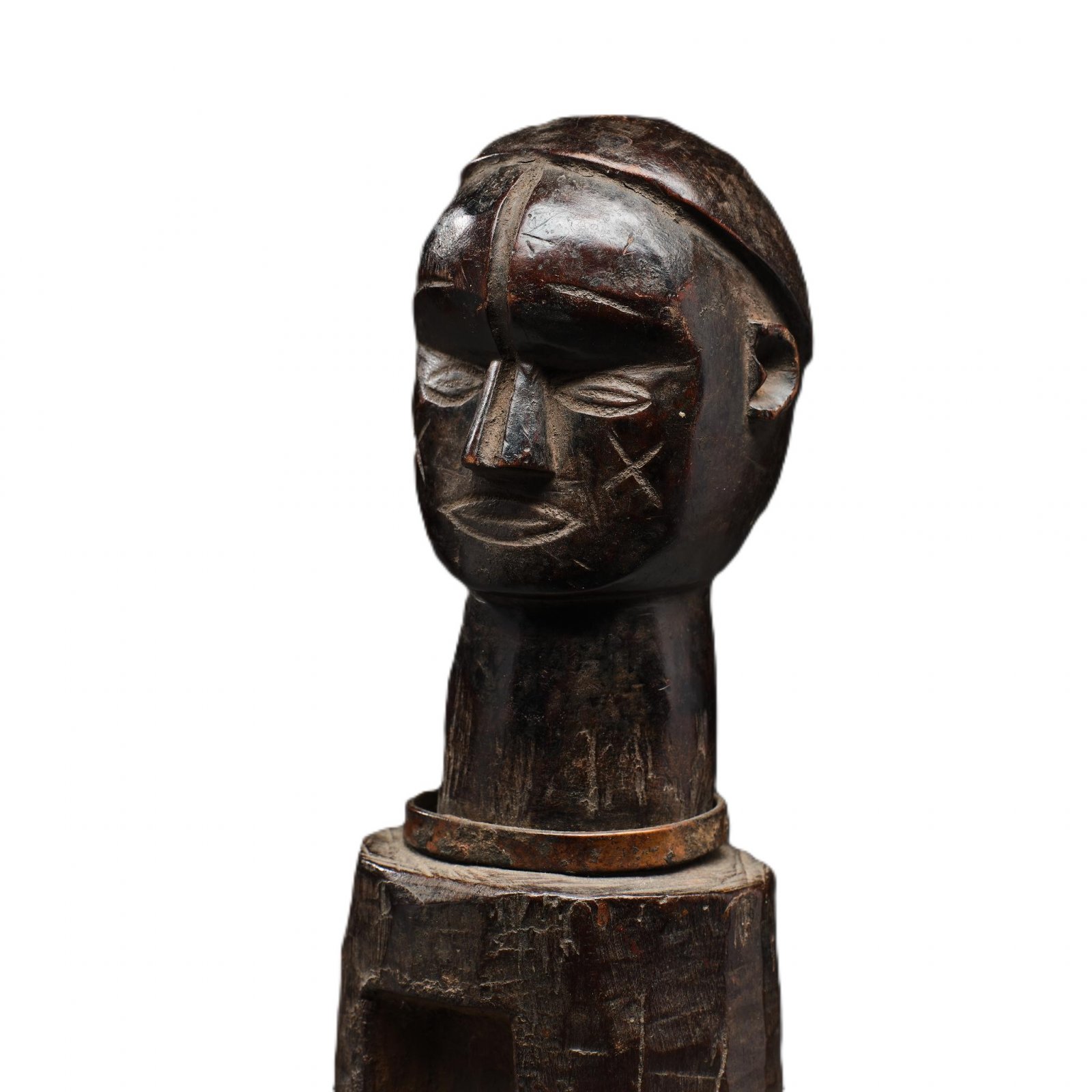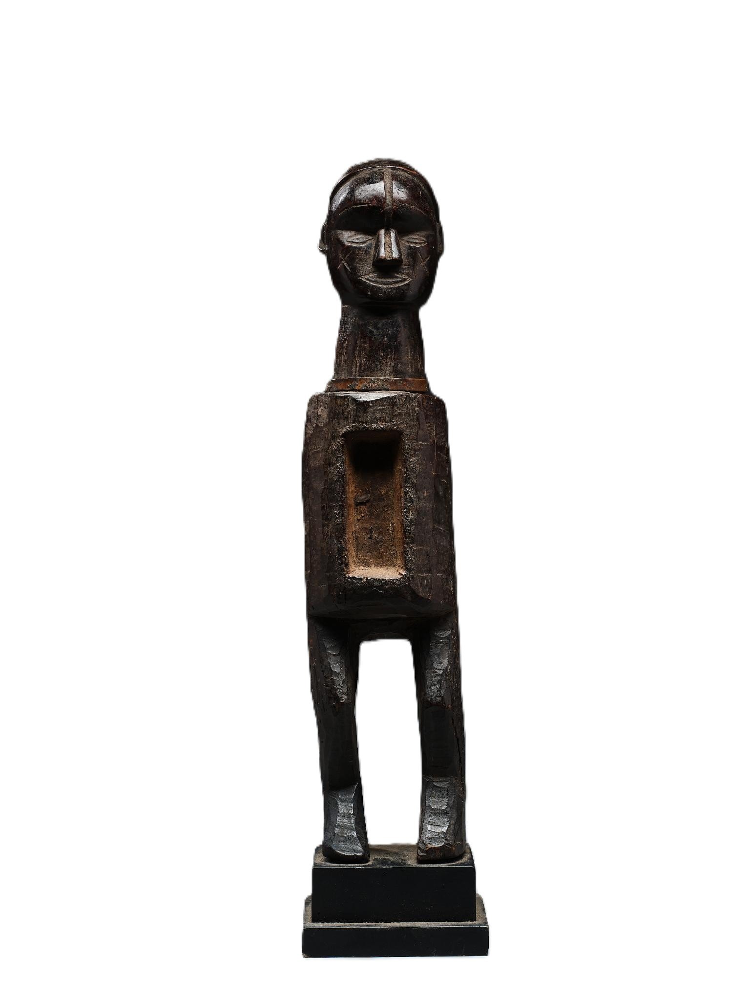 Rituální soška "nkisi" lidu Lega, z východního Konga, s typickým otvorem místo břicha. Do dutiny podobných sošek vkládala pověřená osoba ("nganga") magickou směs bylin, popela, textilií apod., přičemž tyto figury měly mj. ochrannou funkci. .