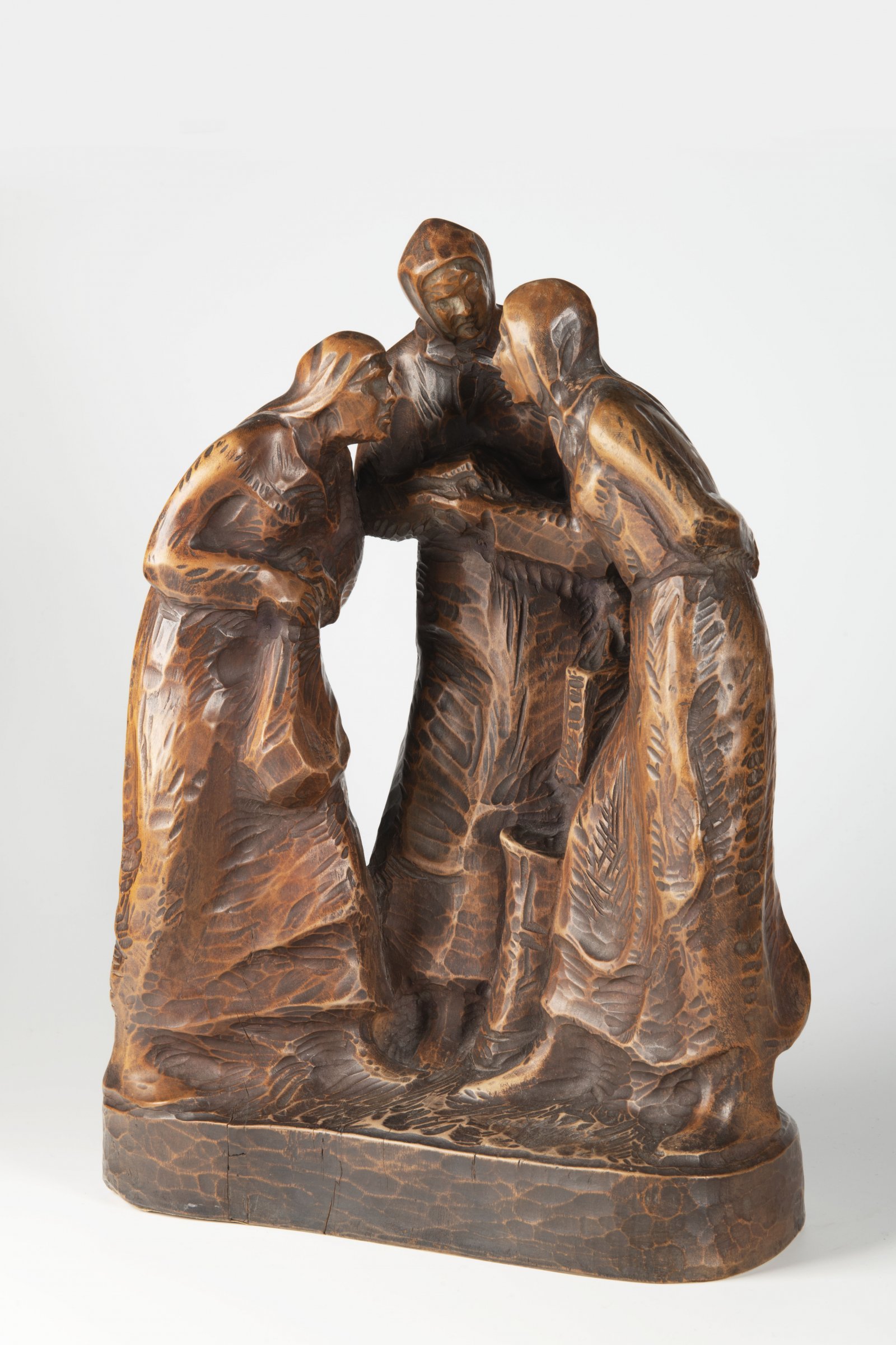 Sousoší tří venkovských žen v rozhovoru, patrně odkazující na Tři sudičky, je od akademického sochaře Leoše Kubíčka, který tvořil své vyřezávané sochy v moderním tvarosloví s prvky lidového umění.