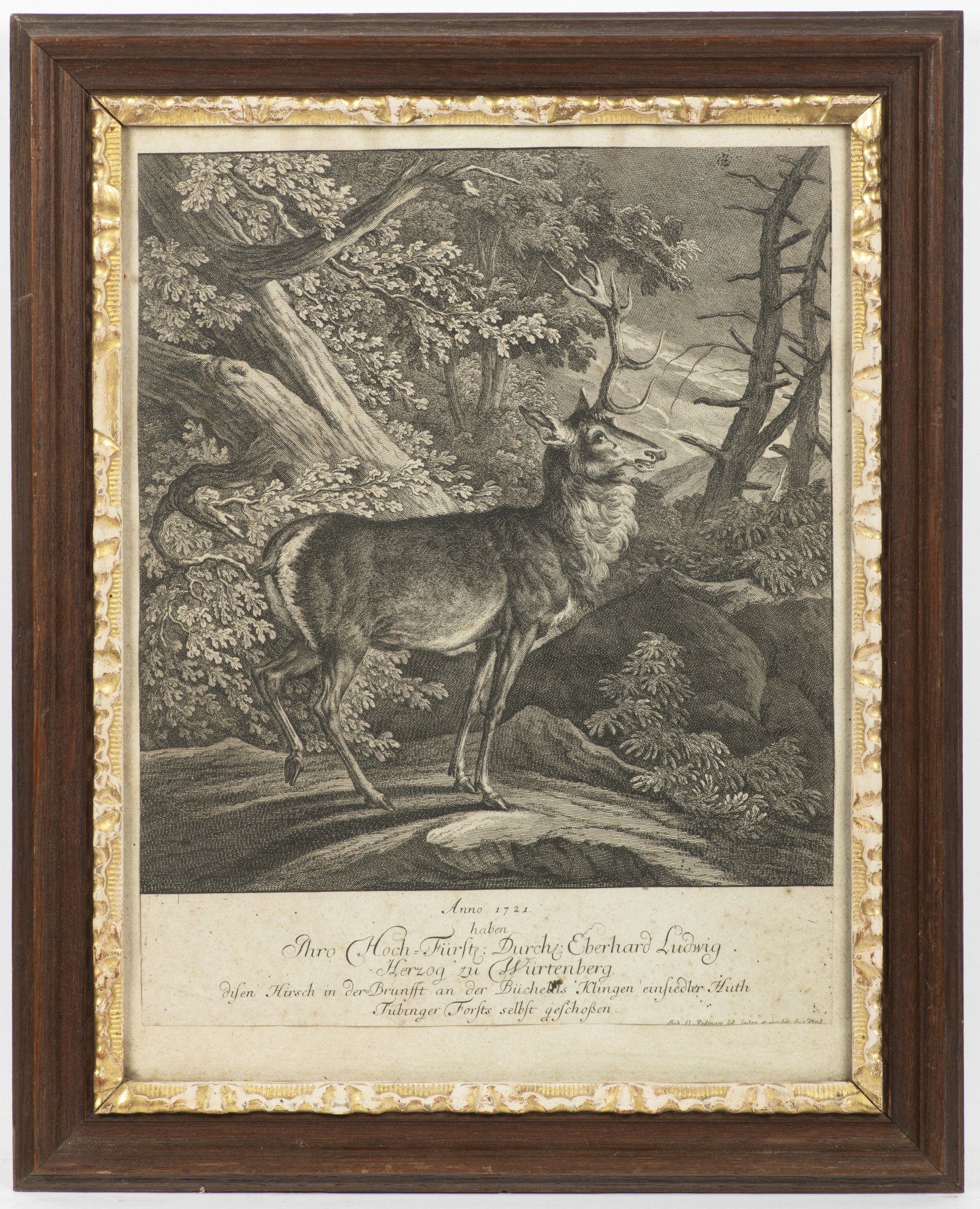 List s motivem jelena od prominentního rytce Johanna Eliase Ridingera, který vynikal v zobrazování zvířat a krajin se zvířaty. Rámováno, oříznuto, místy zahnědlé skvrny.