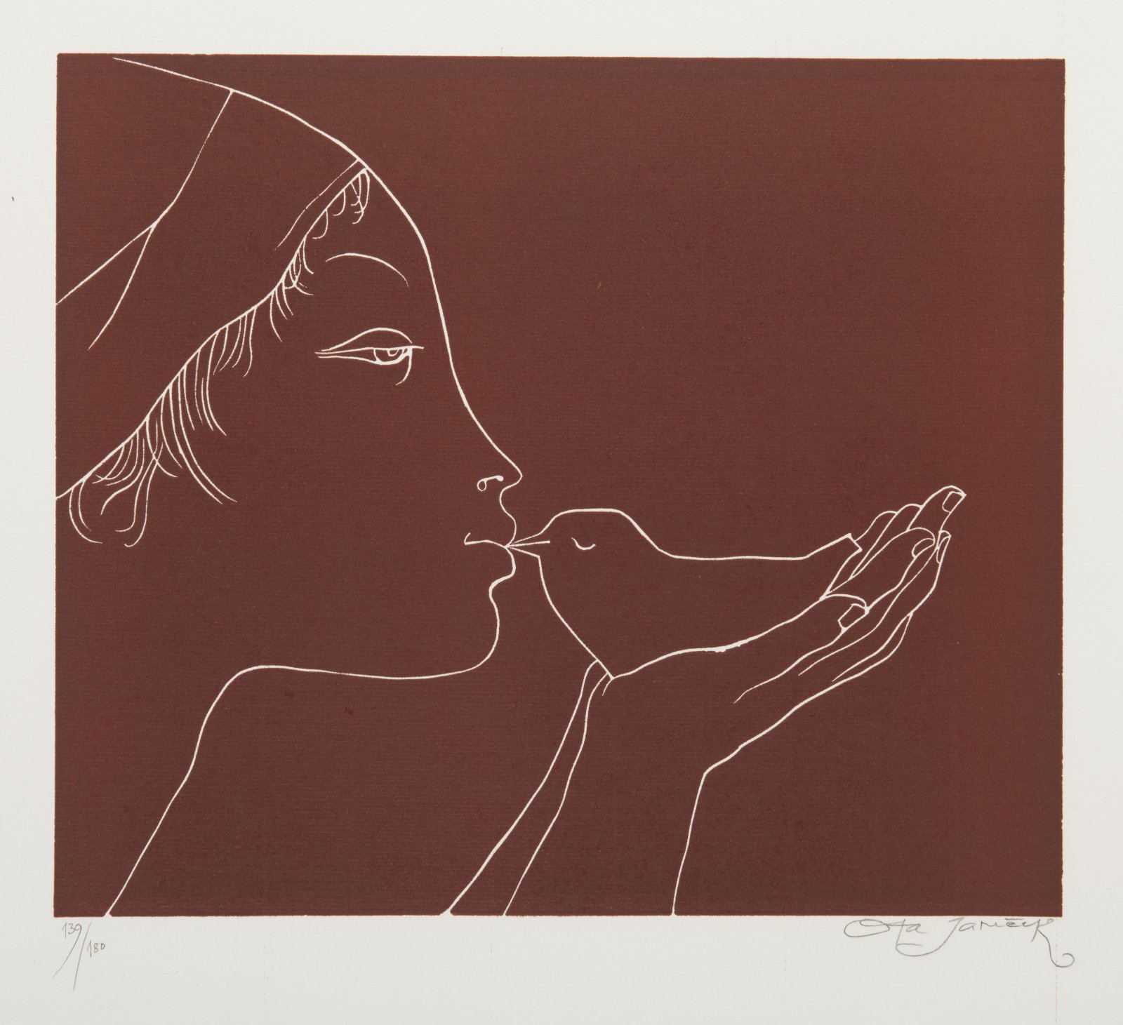 Barevný linonryt zobrazující hlavu ženy líbající ptáčka v dlani je od významného všestraně nadaného malíře Oty Janečka, který ve své tvorbě vycházel z domácí tradice i z odkazu evropské moderny. Volný list, číslováno 139/180.