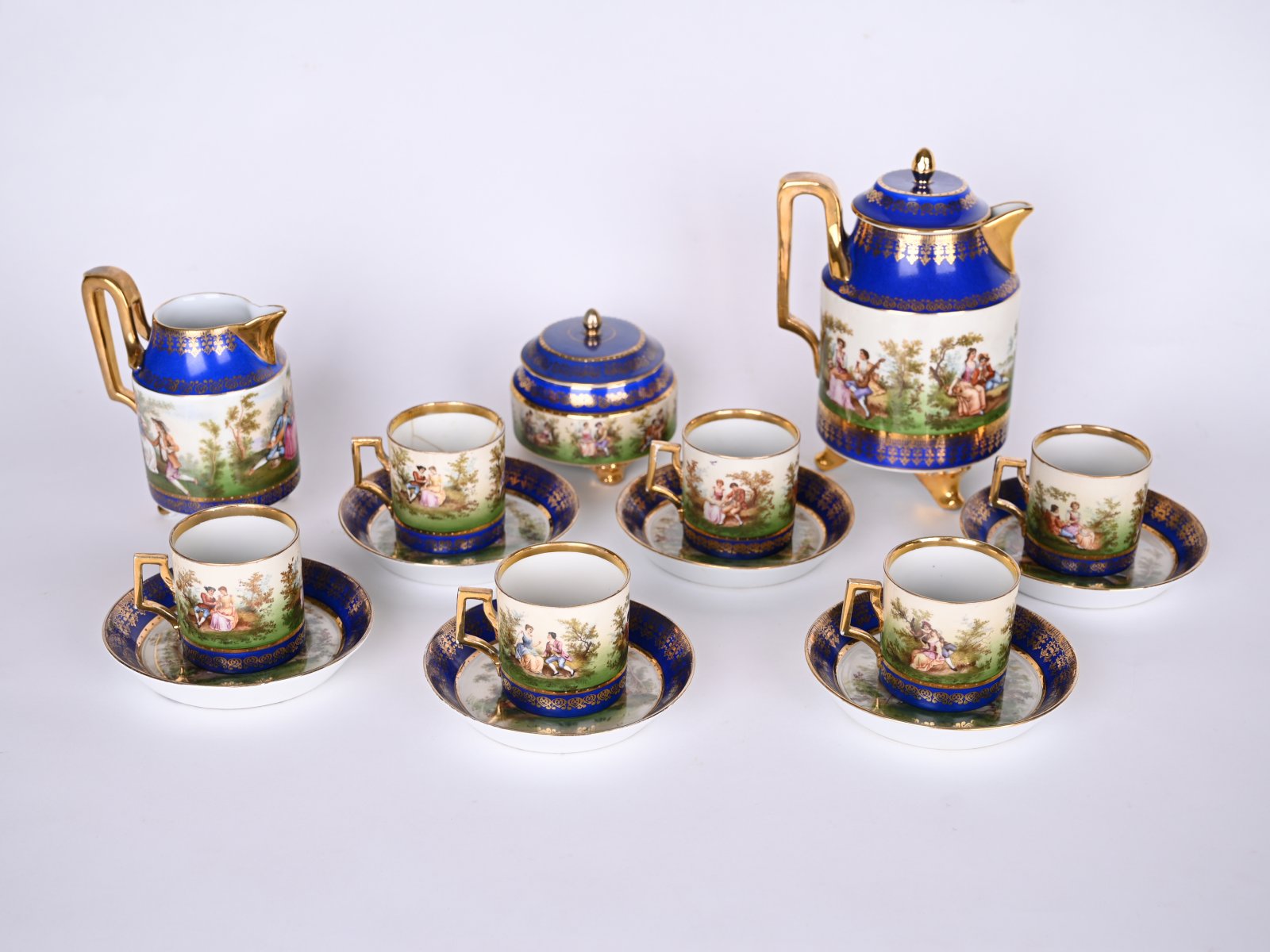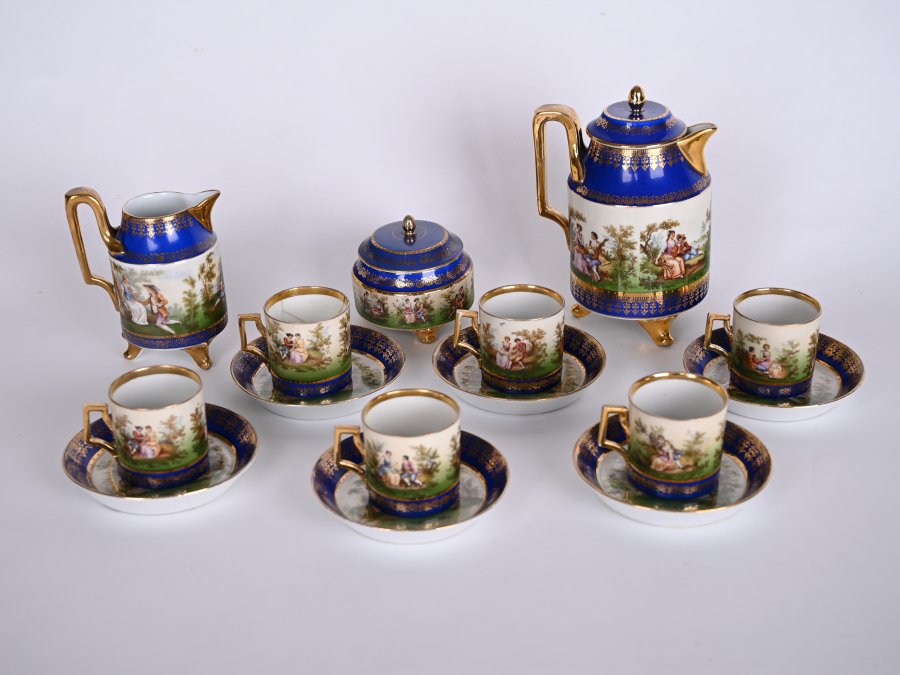Souprava na servírování kávy s romantickými dvorskými dekory pro šest osob, jeden z šálků poškozen a restaurován. Výška konvičky 20 cm, výška šálku 6 cm, mléčenka 15 cm.