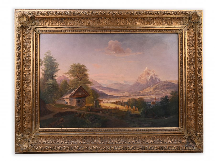 Romantická alpská krajina od Antona Schiffera, rakouského malíře, který studoval na Akademii ve Vídni.