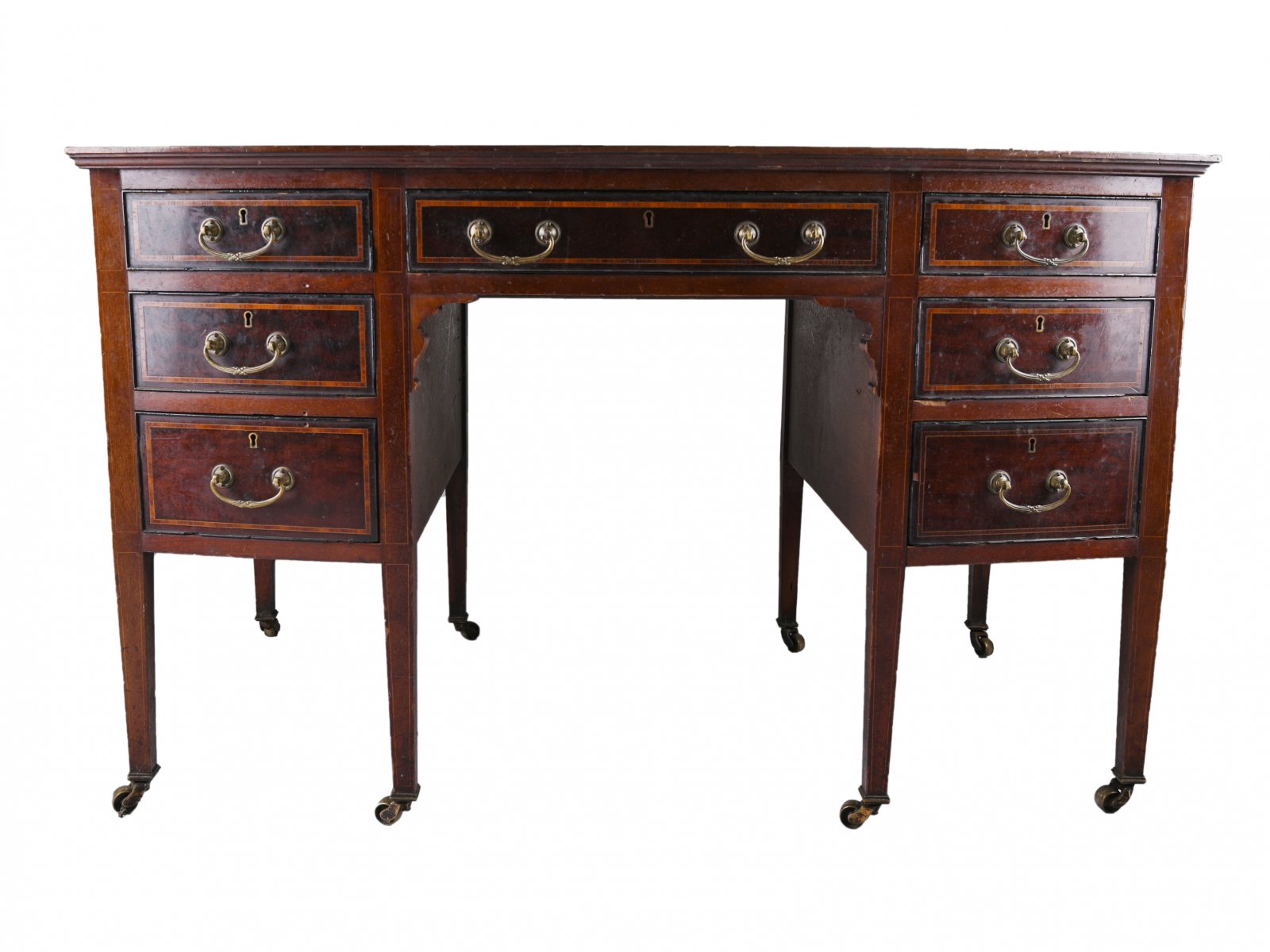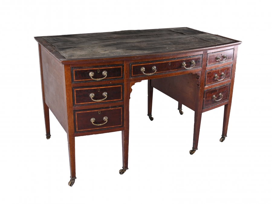 Kvalitně zpracovaný anglický psací stůl s celkem sedmi šuplíky s linkovanou intarzií dřev palisandru a mahagonu. Dobrý stav, horní kožená deska je určena k výměně.