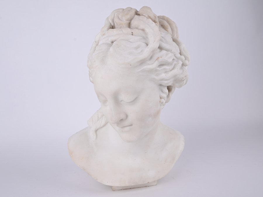 Půvabná busta dívky s přivřenýma očima a splétanými vyčesanými vlasy z carrarského mramoru. Nos restaurován.