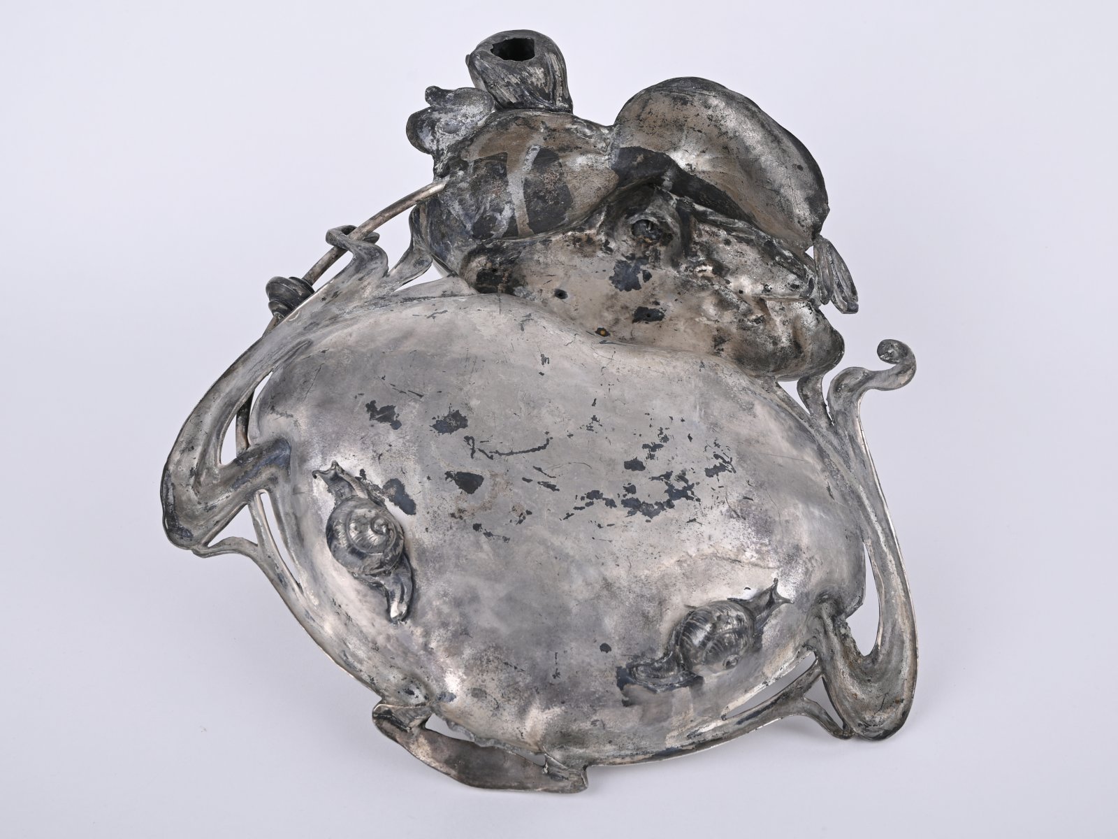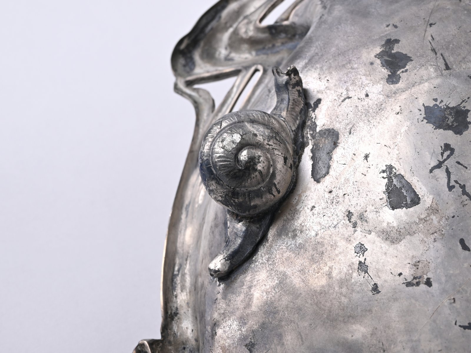 Miska na cukrovinky s půvabným motivem dívky sedící u rybníčku s rybami. Postříbřeno.