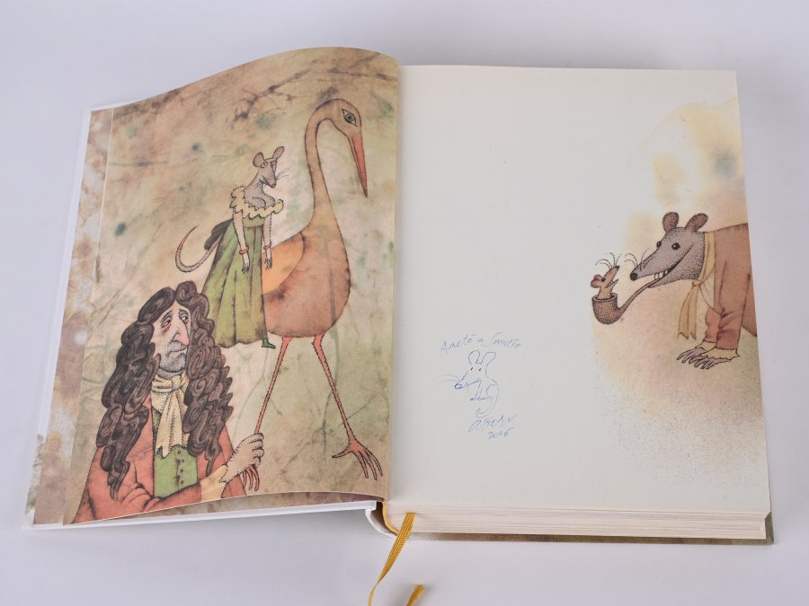 Slavná kniha od Jeana La Fontaine z roku 1668 se stovkami ilustracemi od českého výtvarníka Adolfa Borna s jeho kresbou dedikovanou a datovanou s podpisem. Originální ilustrovaná papírová vazba.