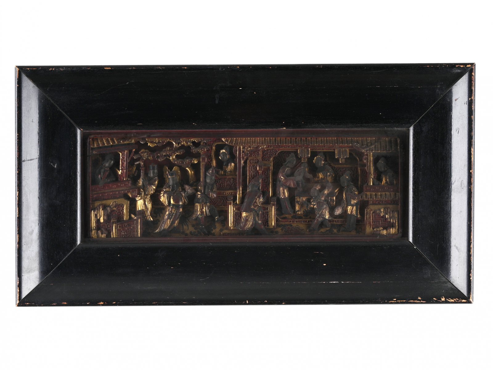 Reliéf v duchu tradice z provincie Guangdong, pravděpodobně původně dekorativní prvek v domě movitého člověka, či dekorativní prvek nábytku.