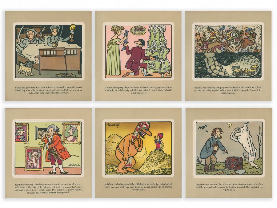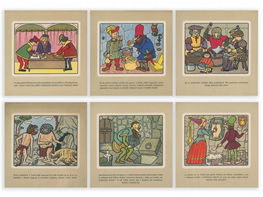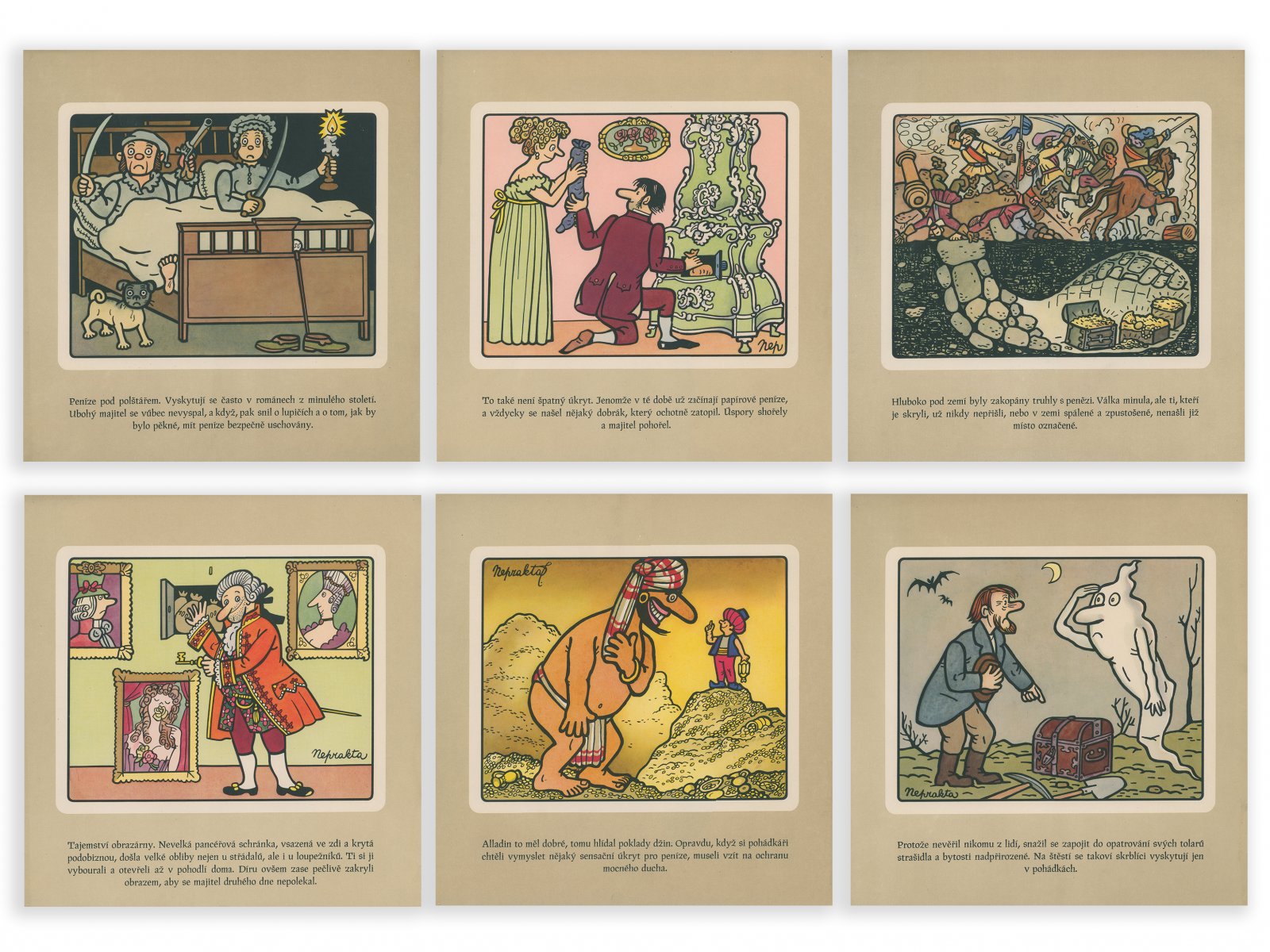Dva plakáty z výstavy o spoření a 27 menších ilustrací od Jiřího Wintera Neprakty, autora s charakteristickým rukopisem i humorem.