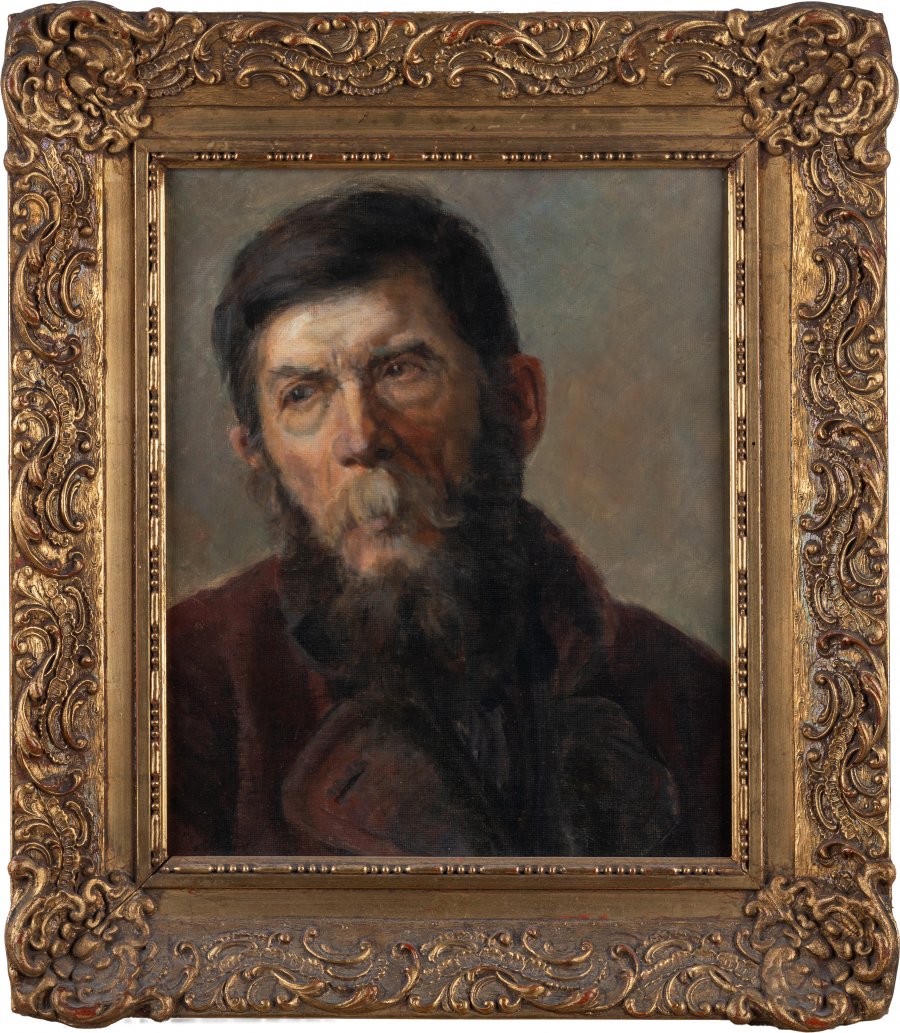 Umělecky vyzrálý příklad akademického portrétu staršího muže. Verso štítek se jménem.