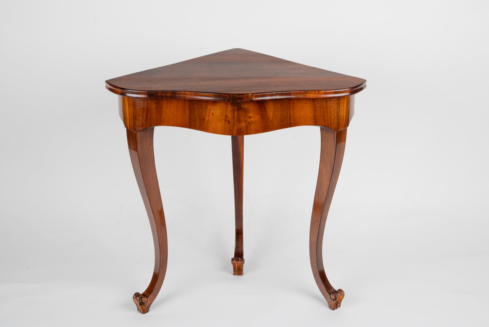 Elegantní odkládací rohový stolek se třemi nohami zakončené volutovou řezbou celkově s barokním tvaroslovím je z ořechového dřeva s bohatou kresbou. Kompletně restaurováno
