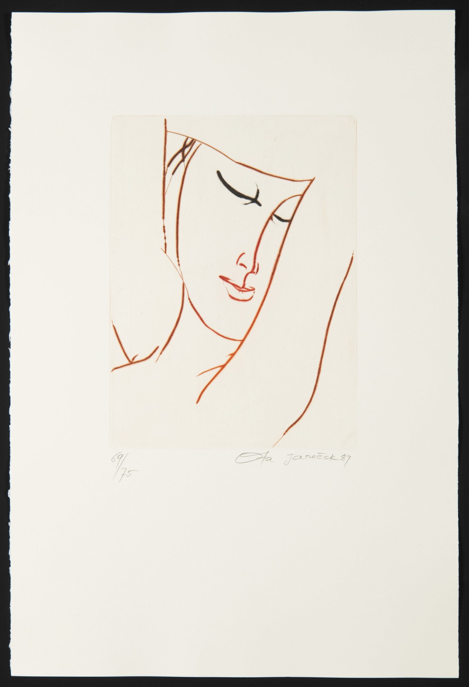 Hlava spící ženy provedená technikou suché jehly od významného všestraně nadaného malíře Oty Janečka, který ve své tvorbě vycházel z domácí tradice i z odkazu evropské moderny. Od počátečních impulzů kubismu, lyrického figuralismu či francouzského kolorismu, obracel pozornost k vlastnímu nezaměnitelnému projevu. Pokud šlo o kresby dívek či dívčí akty, prostupují tvorbu Oty Janečka kontinuálně a představují časosběrný dokument jeho přístupových východisek. Uvedený rozměr je rozměr listu.