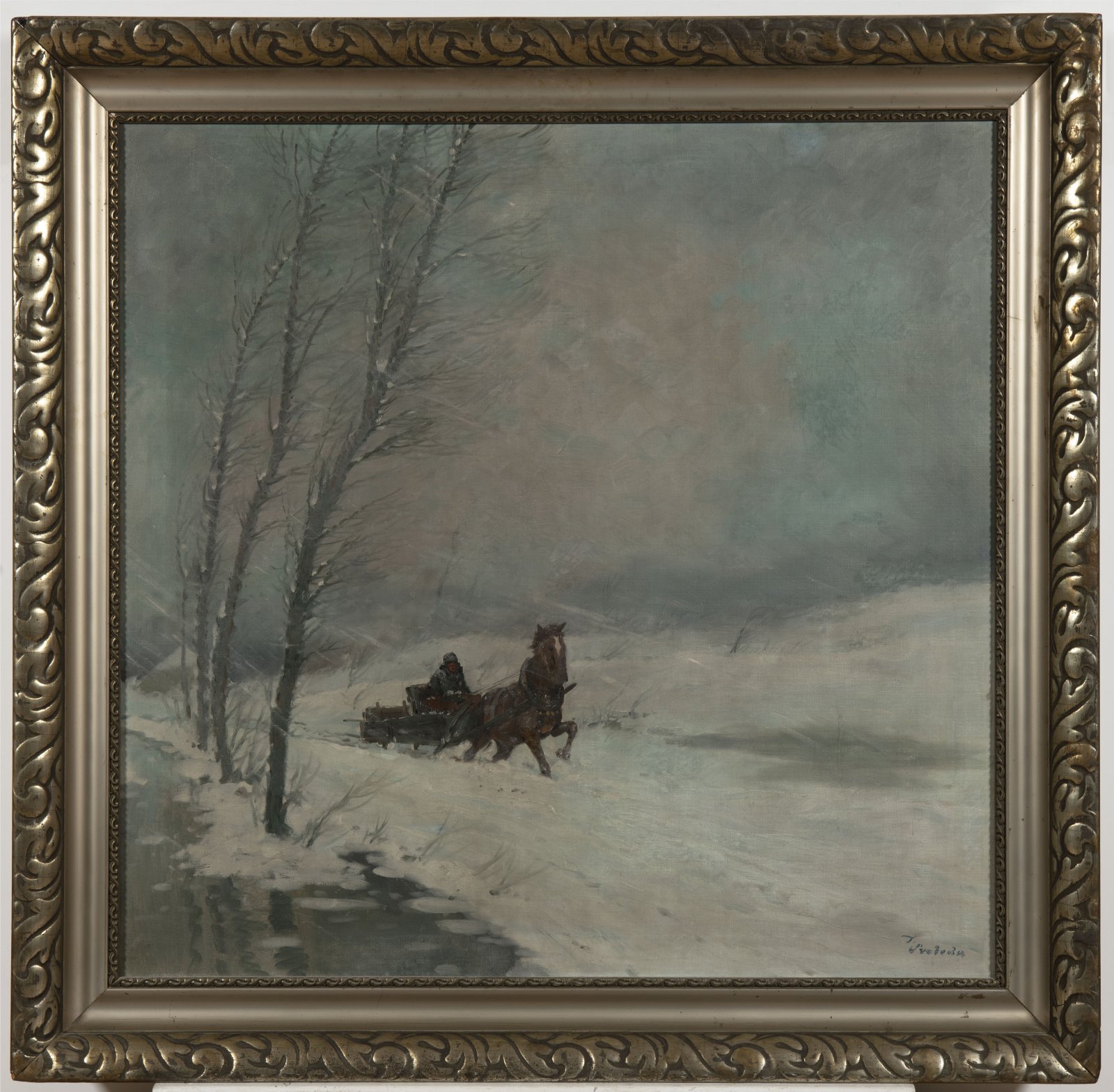 Josef Svoboda zpracoval nespočet krajinných motivů - zejména exotických. Pracoval i jako grafik. Předložené dílo je jedním z nemnoha záznamů zimní české krajiny.