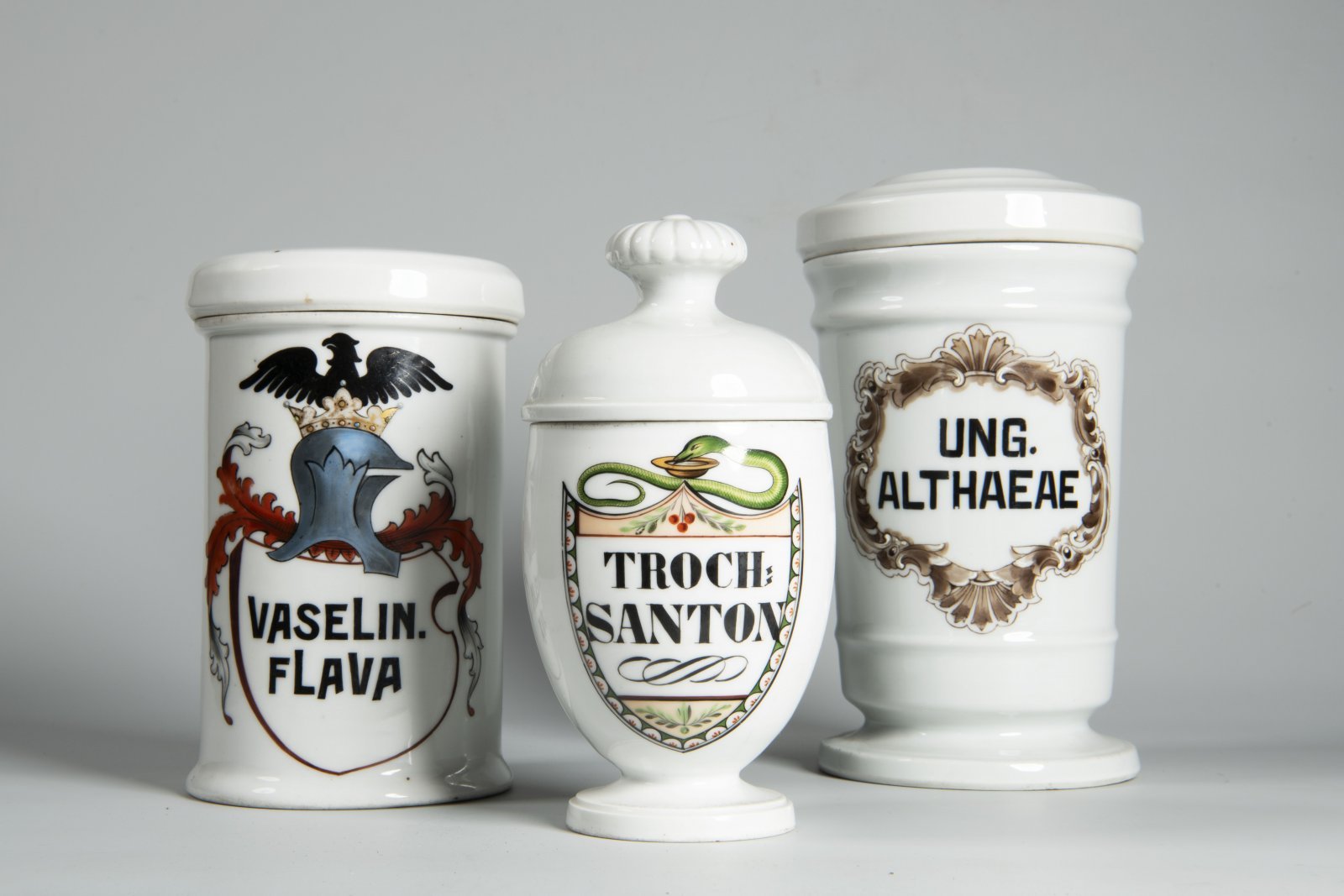 Trojice lékárenských dóz z období Biedermeieru. Dvě z dóz pravděpodobně nesou i znaky původních lékáren.