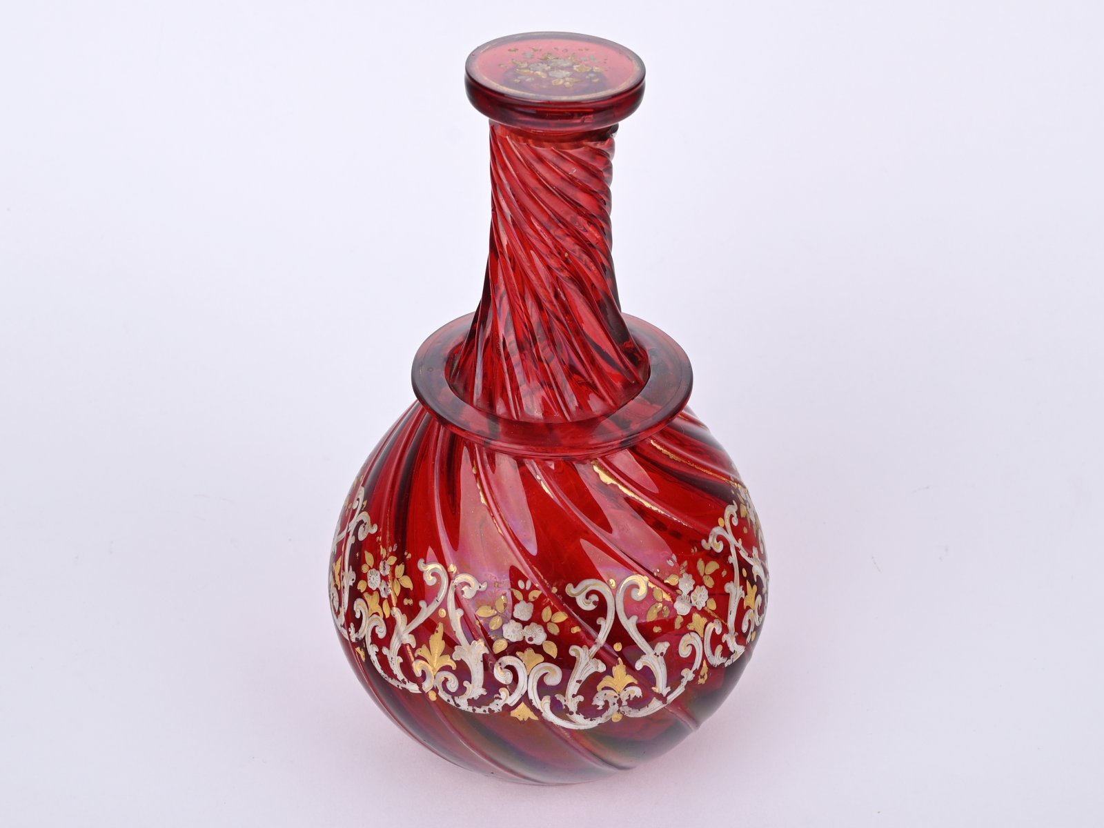 Skleněná karafa s červenou lazurou a malovaným florálním dekorem, severní Čechy.