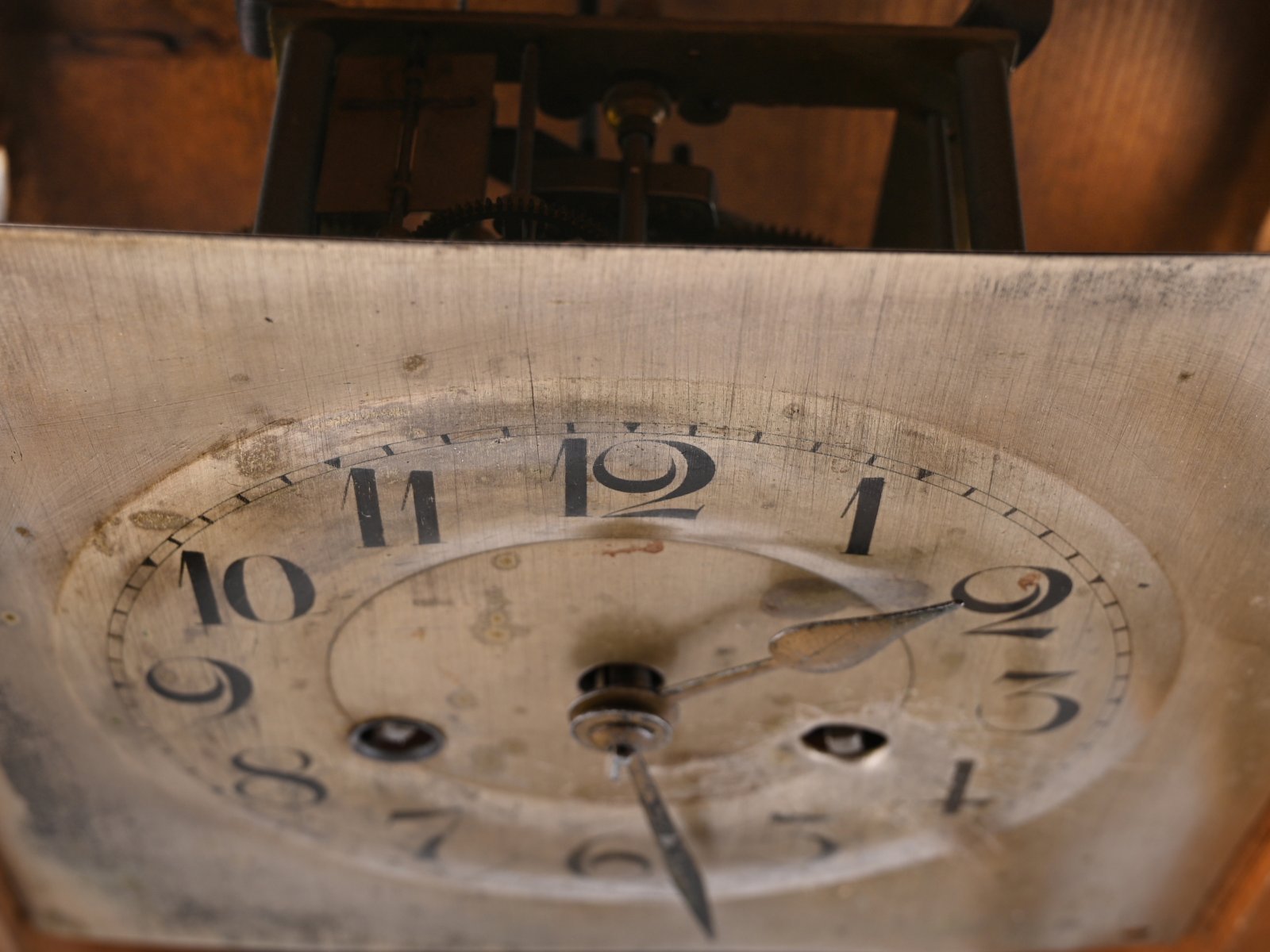 Hodiny s postříbřeným ciferníkem a mosaznou montáží do níž je zasazen malovaný kámen s motivem brouka.