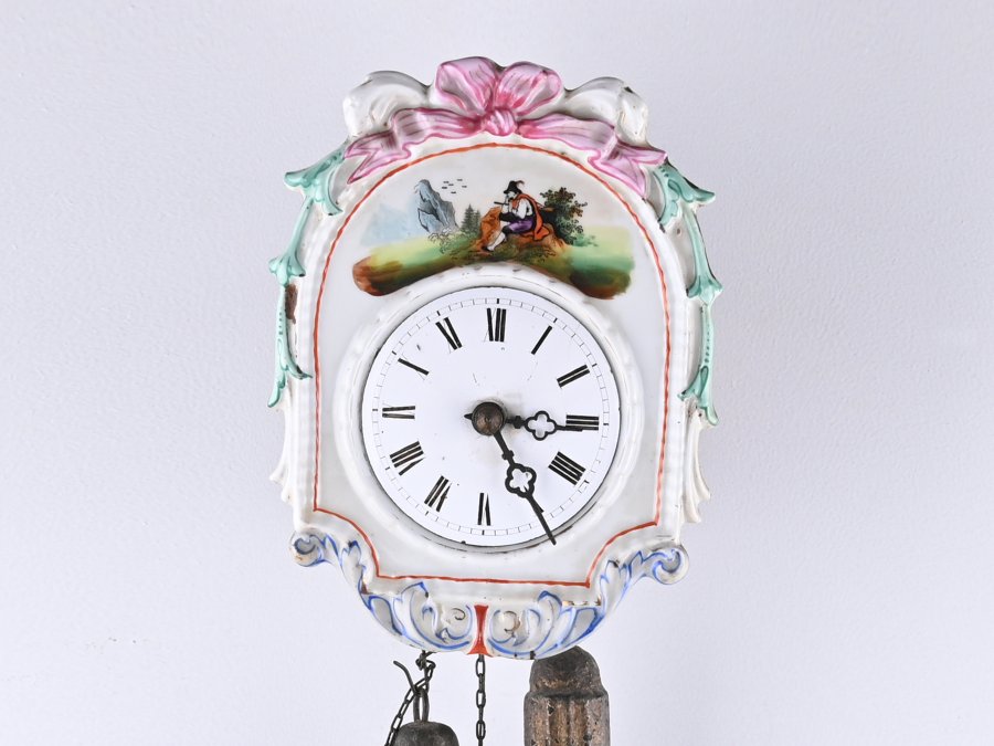 Barevné závěsné porcelánové hodiny se dvěma závažími s loveckým motivem. Výborný stav.