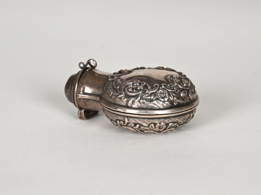 Drobná otevírací stříbrná lahvička s florálním dekorem.