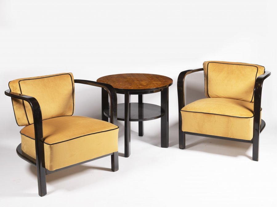 Párová, kvalitně zpracovaná křesla stojící na třech nohách jsou tvořena elegantní ohýbanou konstrukcí z mořeného buku a čalouněna s černou linkou. Vrchní deska stolu je z topolové kořenice. Restaurováno. Nově čalouněno. Křesla: 79 x 68 x 65 cm. Stůl: 57,5 x 65 cm.