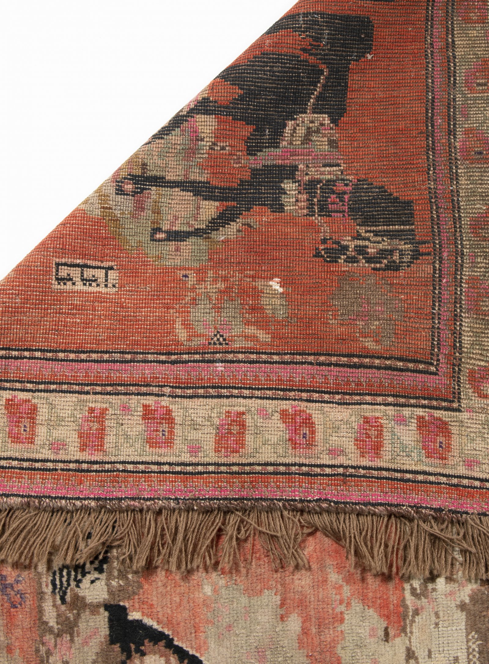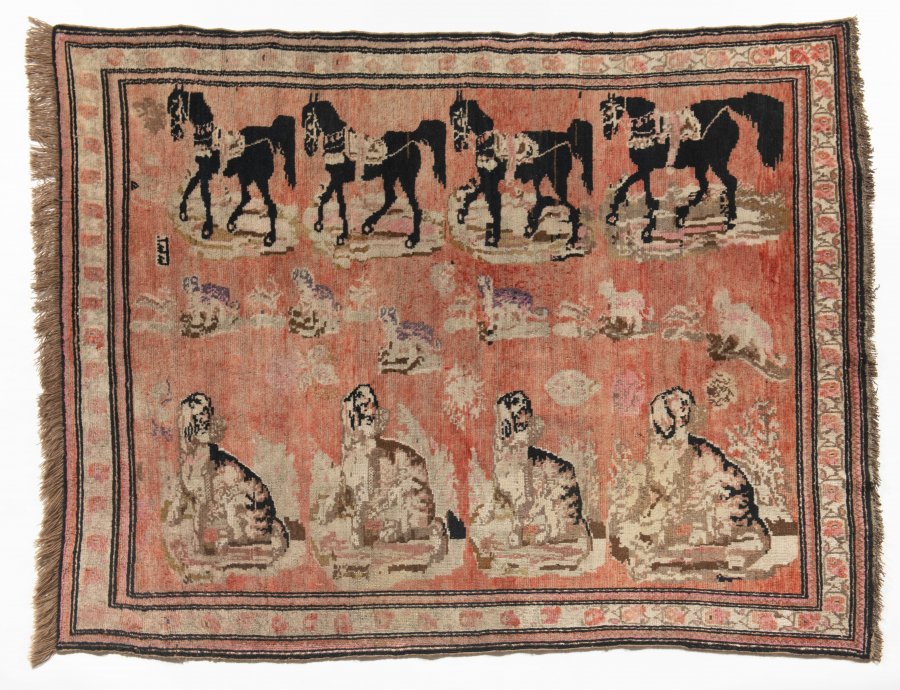 Jižní Kavkaz, Karabach, 1911. Datovaný vlněný koberec (r. 1330 islámského letopočtu) s dominujícím vyobrazením koňů a psů v horizontálním formátu, svého času oblíbený design jak arménských, tak též ázerbájdžánských rodinných manufaktur. V borduře lze nalézt další oblíbený motiv Karabachu, a to výrazné kytice růží. Tento typ karabašského designu s koňmi a psi bývá znalci označován jako "Atli-Itli", v našem případě je však vzácný starožitný exemplář neobvykle doplněn i vyobrazením koček ve střední části pole.