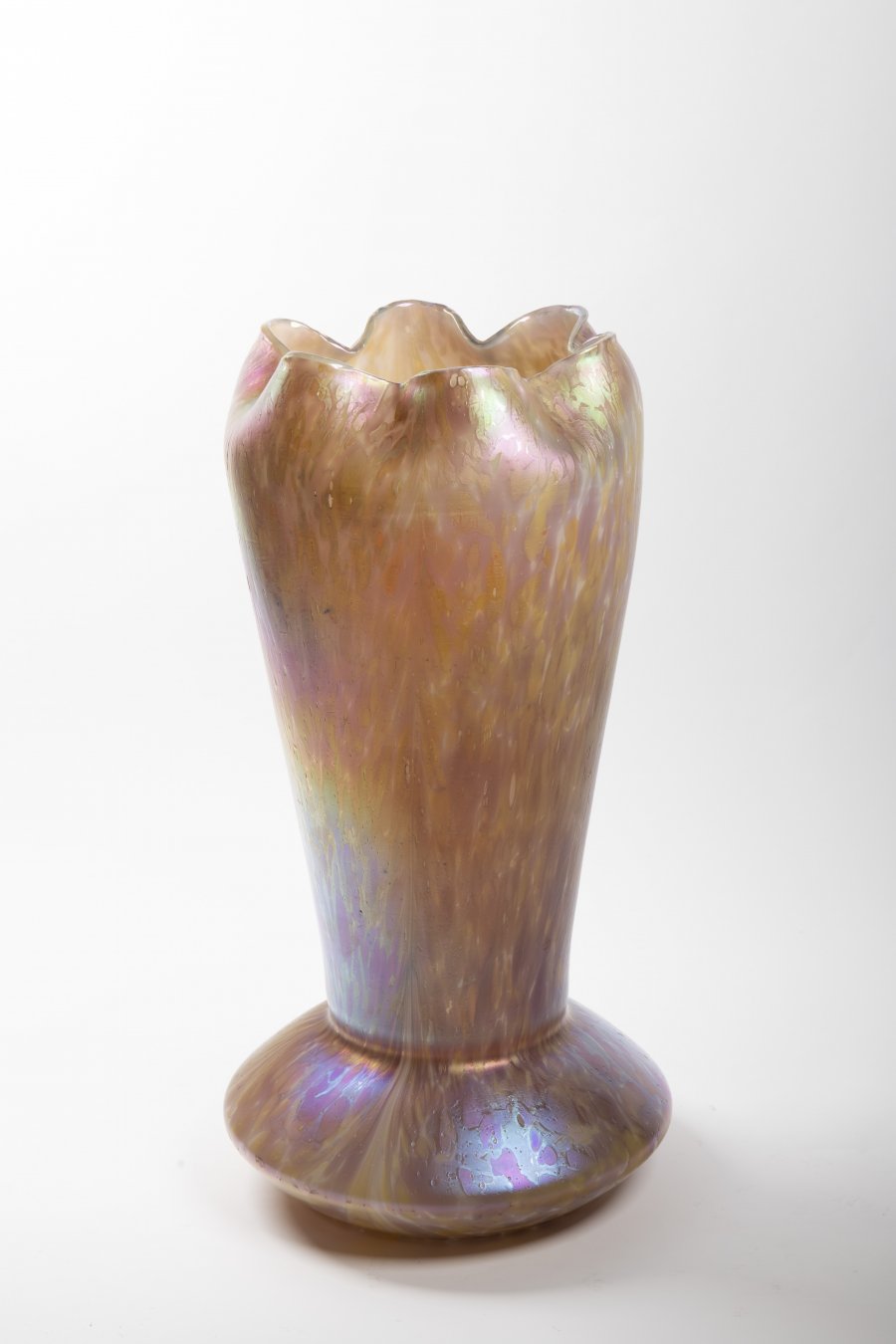 Impozantní secesní váza z opálového skla foukaného do formy s irisovaným dekorem z produkce sklárny Wilhelm Králik a syn Lenora.
