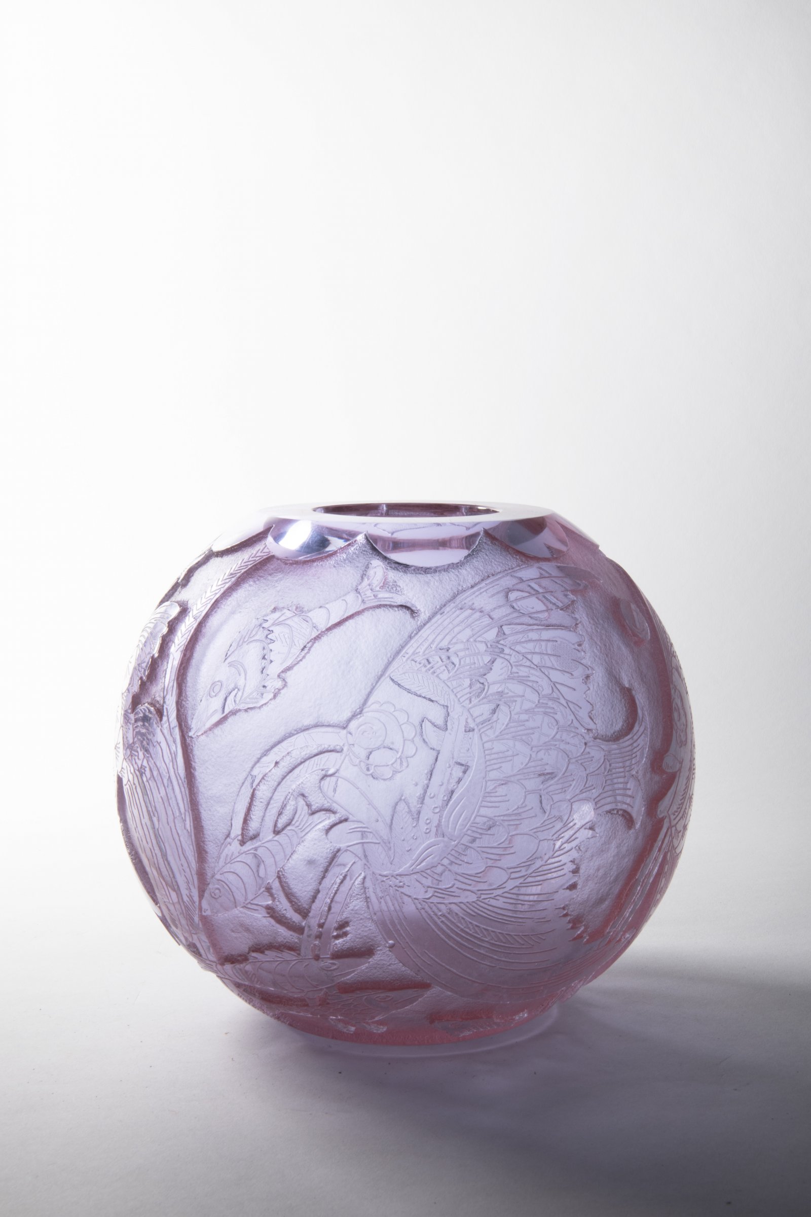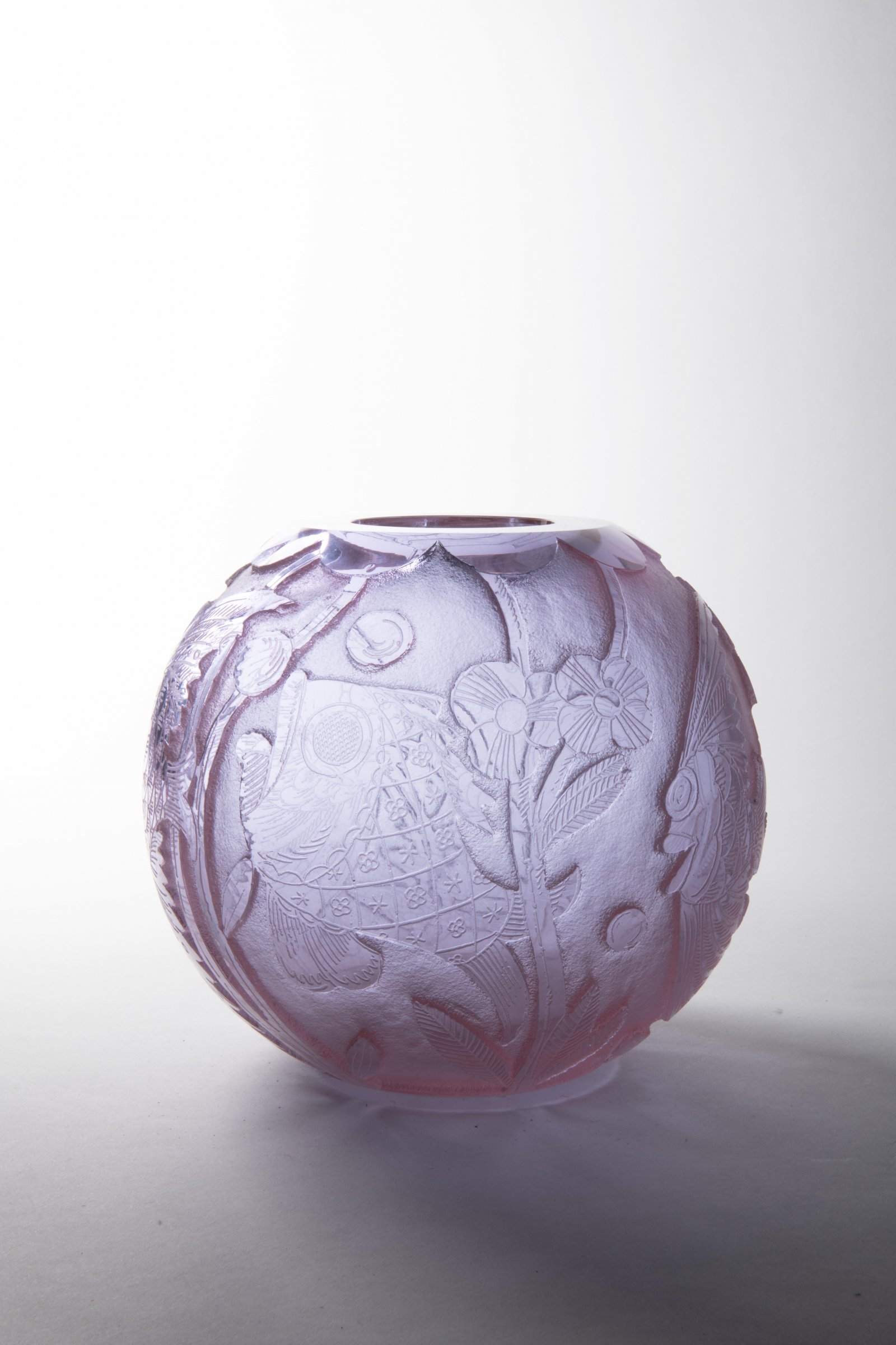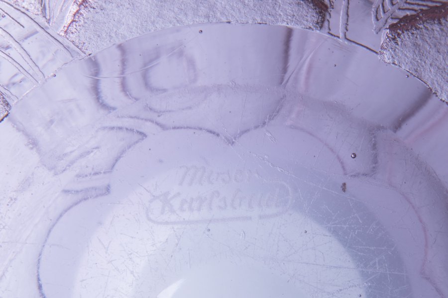 Váza z produkce sklárny Ludwig Moser a synové z Karlových Varů nabízí jedinečný hluboce leptaný dekor na růžovém alexandritovém skle foukaném do formy. Návrh dekoru - Heinrich Hussmann.